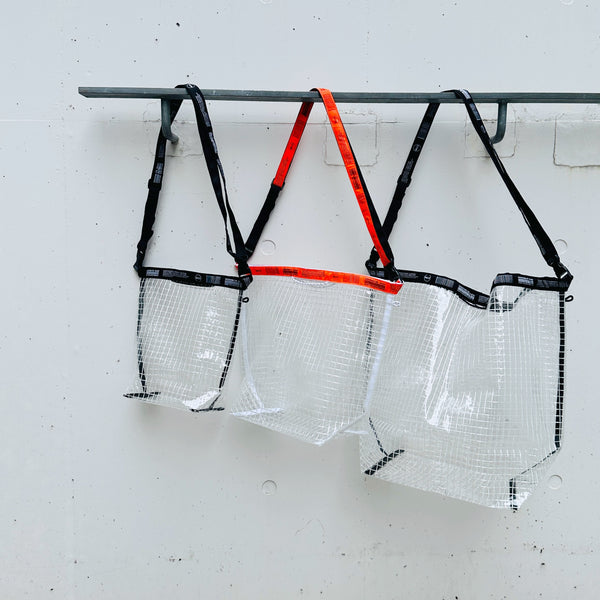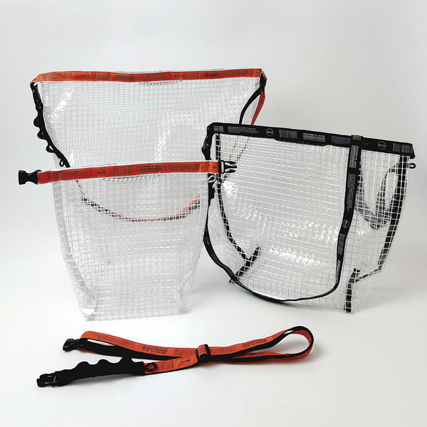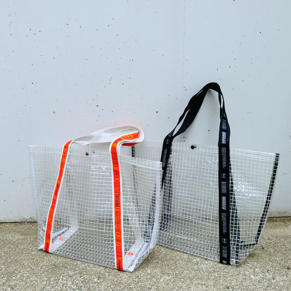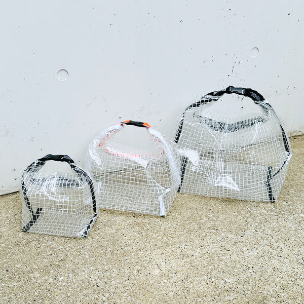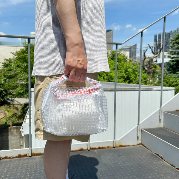 透明のPVC生地に格子状に入ったラインが特徴の本体生地は、汚れやちょっとした水滴もさっとふける素材。