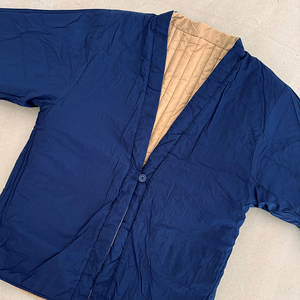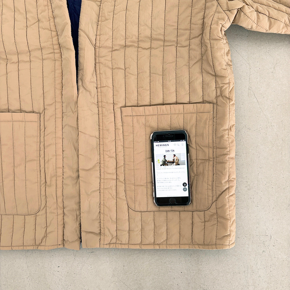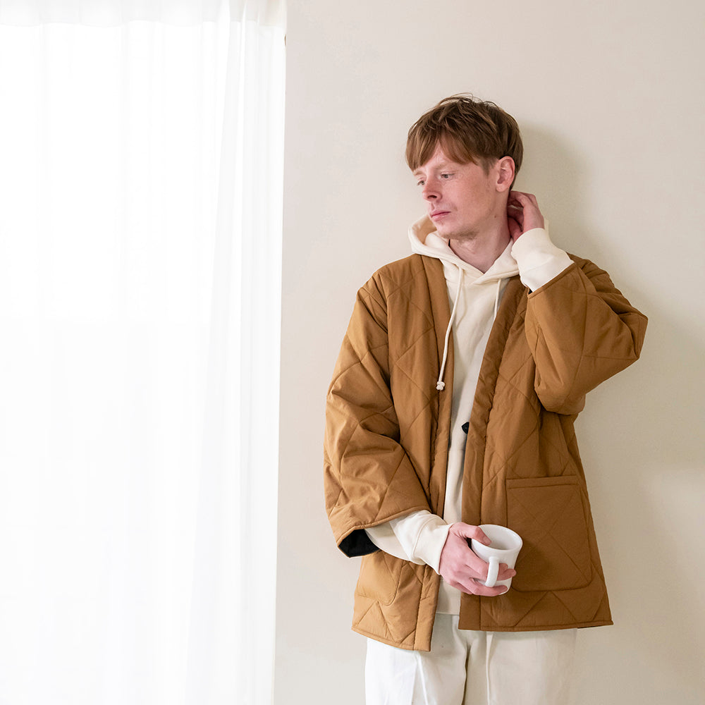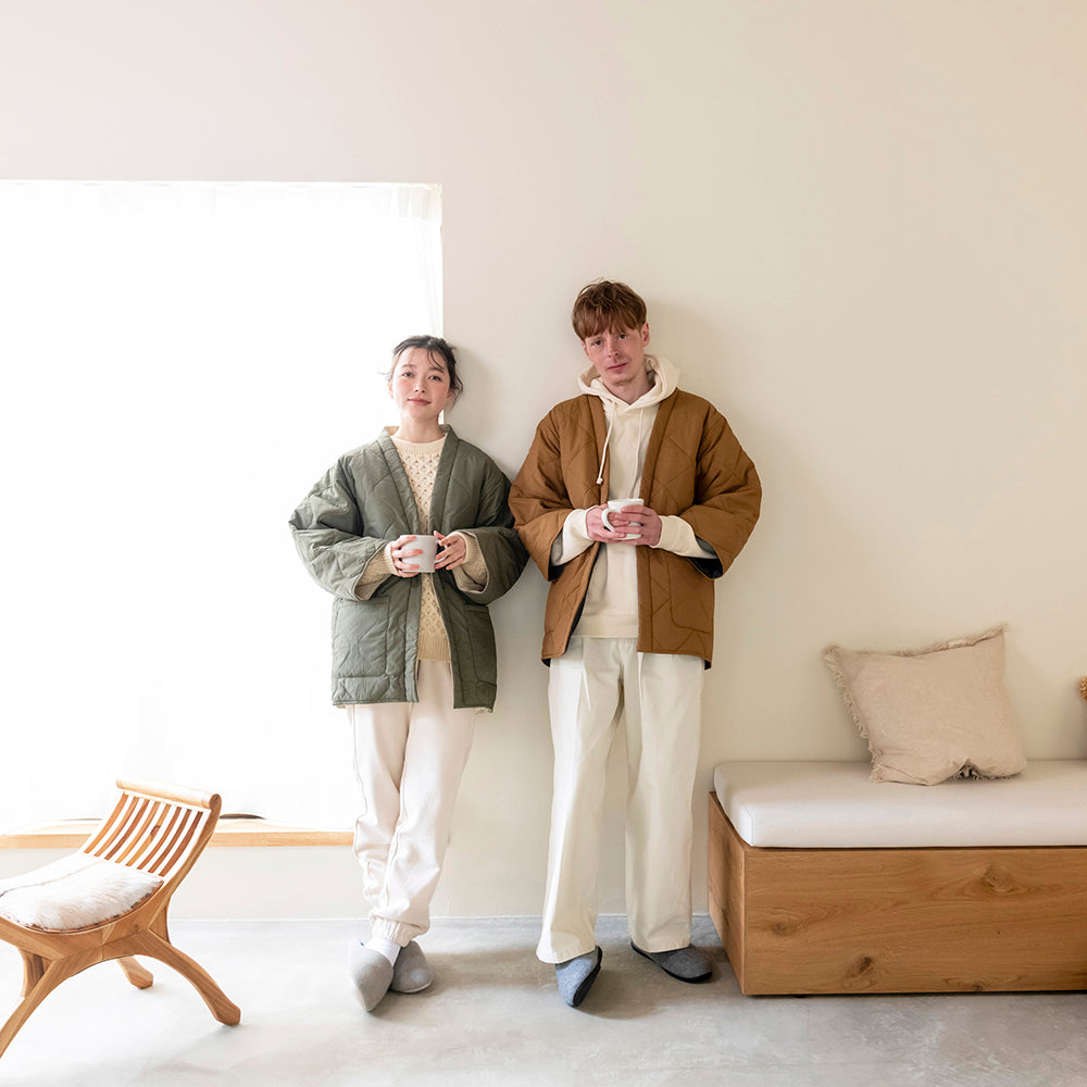 "軽い着心地と、小さくたためるパッカブル仕様が特徴のはんてん型の羽織り【COM-FLY/ コンフリー】 家族やパートナーと兼用もできるサイズ展開で、様々なライフスタイルに合わせてお使いいただけます。 節電意識が高まり冬の羽織需要が高まっている今日この頃。この冬は新しい冬の定番 【DAN-TEN】を纏い、現代の半纏を着るというちょっとだけ 時別な気分を味わいながら暖かく快適に過ごしてみませんか "