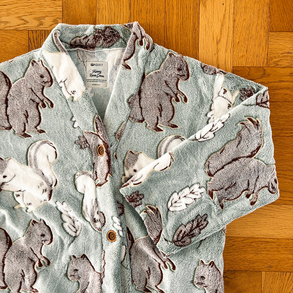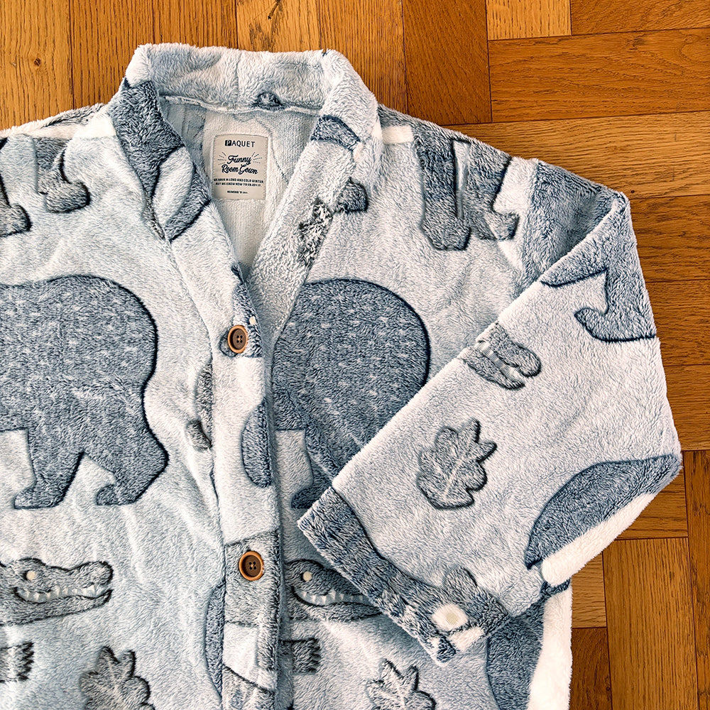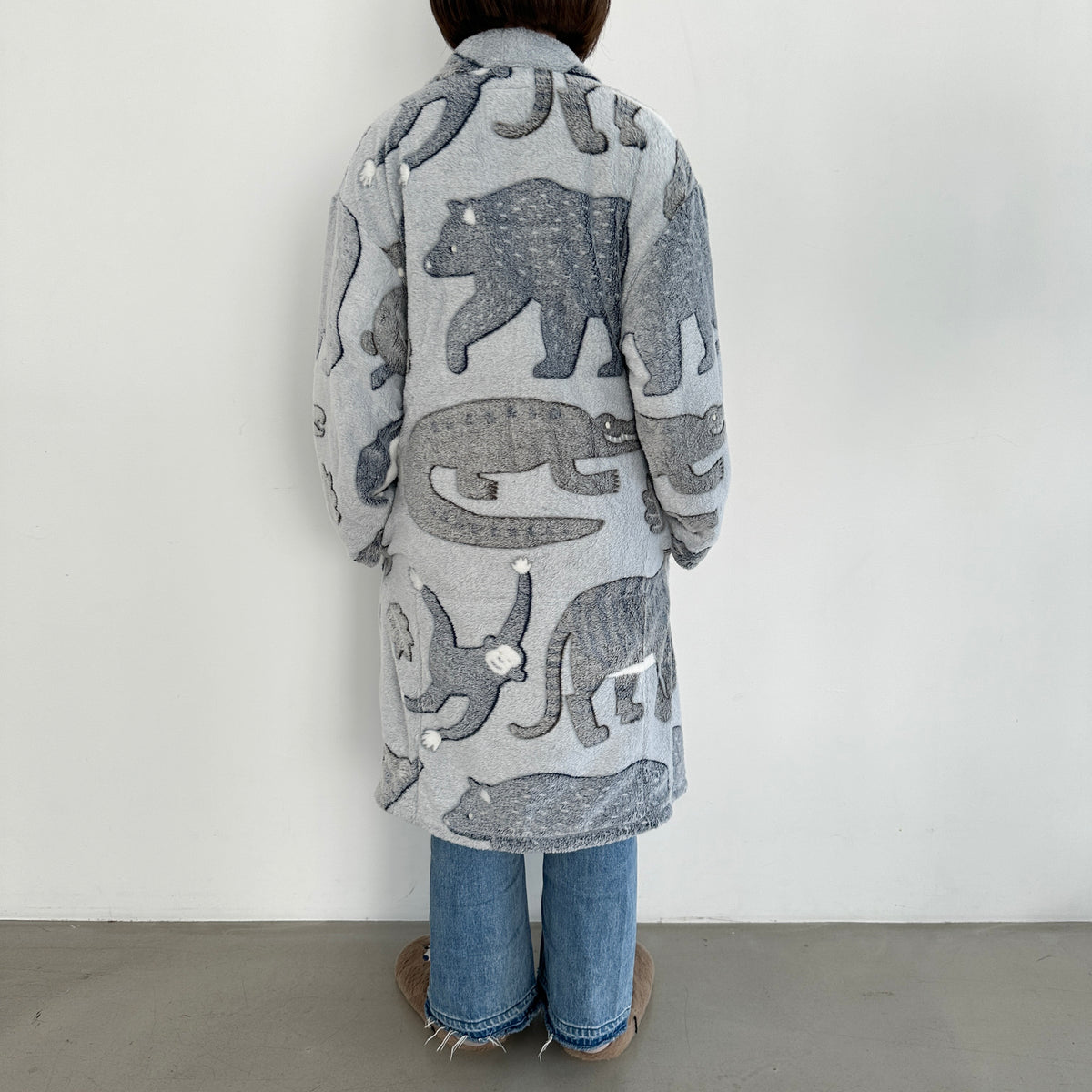 暗闇に浮かび上がる動物たちのシルエット。遊び心満載のルームガウンです!
