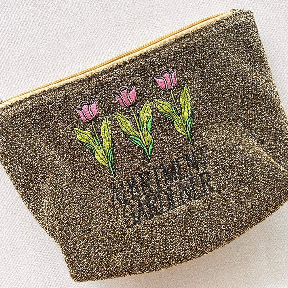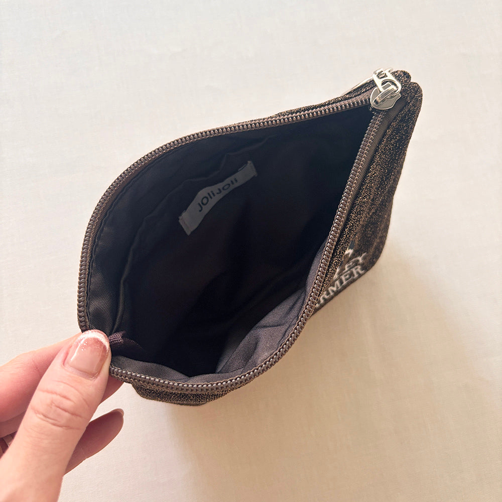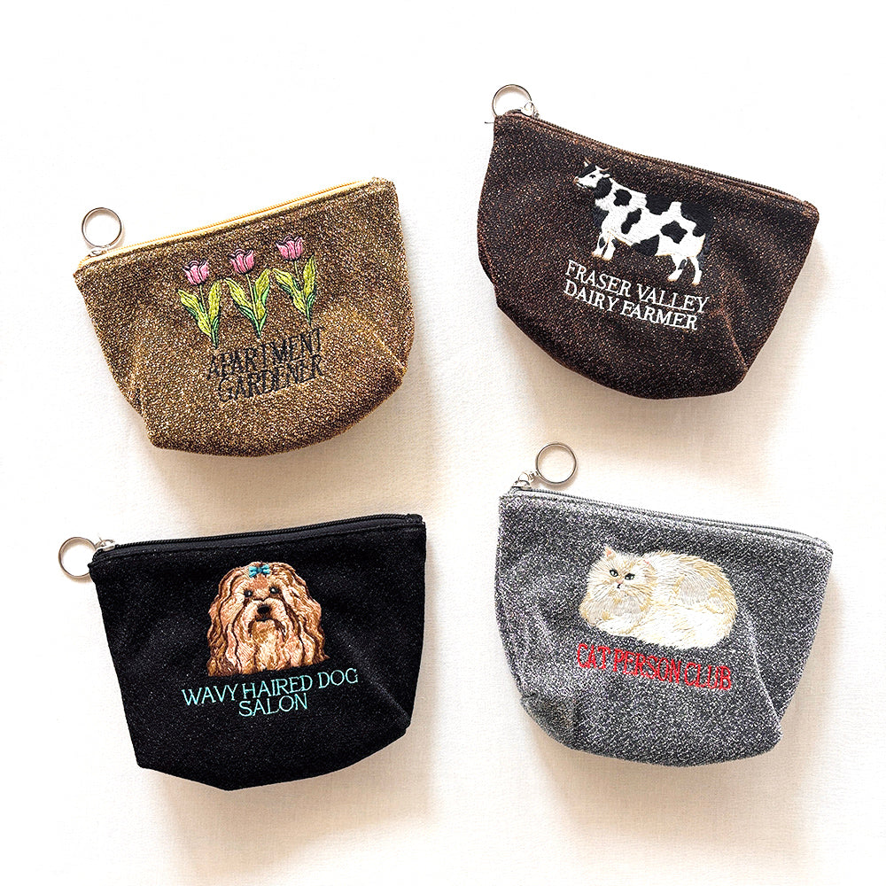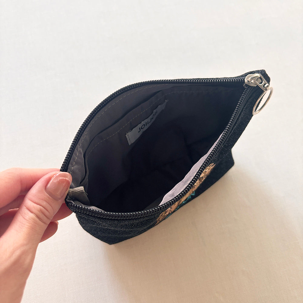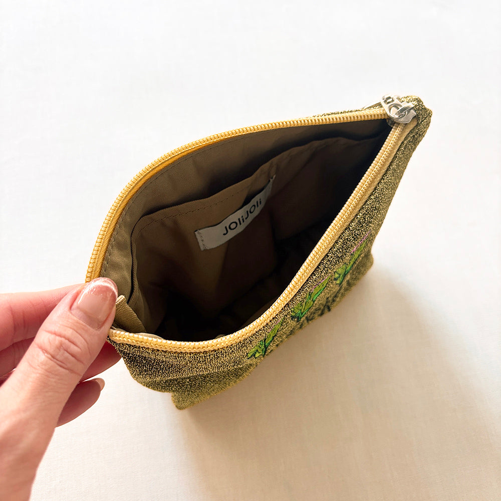 海外のローカルエリアをデザインテーマにした、刺繍ラメ生地ポーチ。