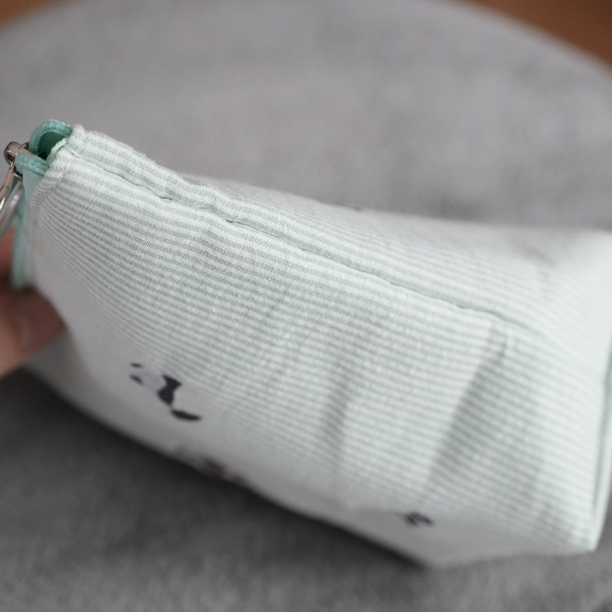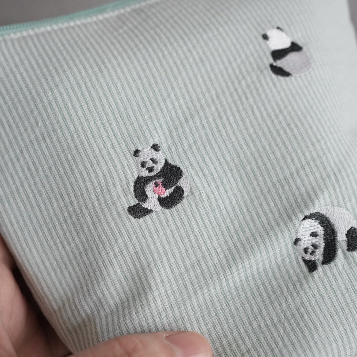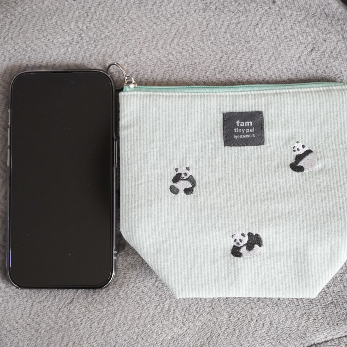 チャーミングな動物たちの刺繍が施されたポーチ。 ボンディングされている仕様と程よいサイズ感です。