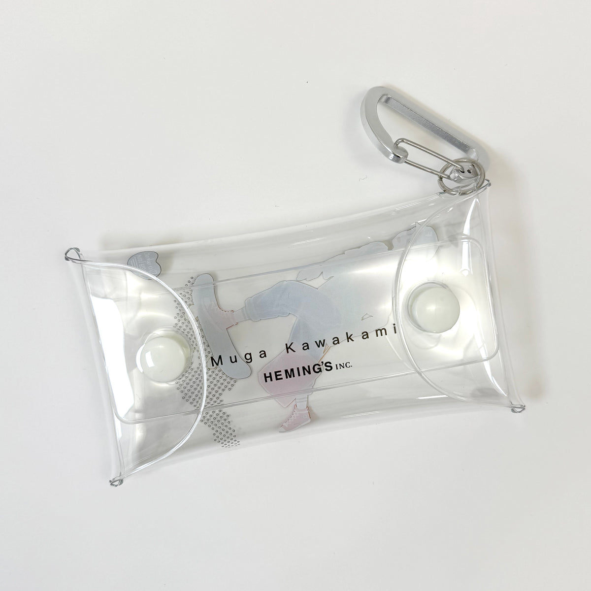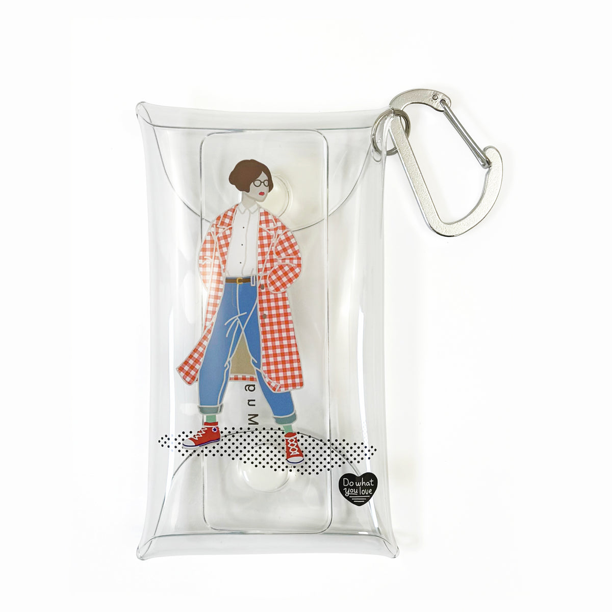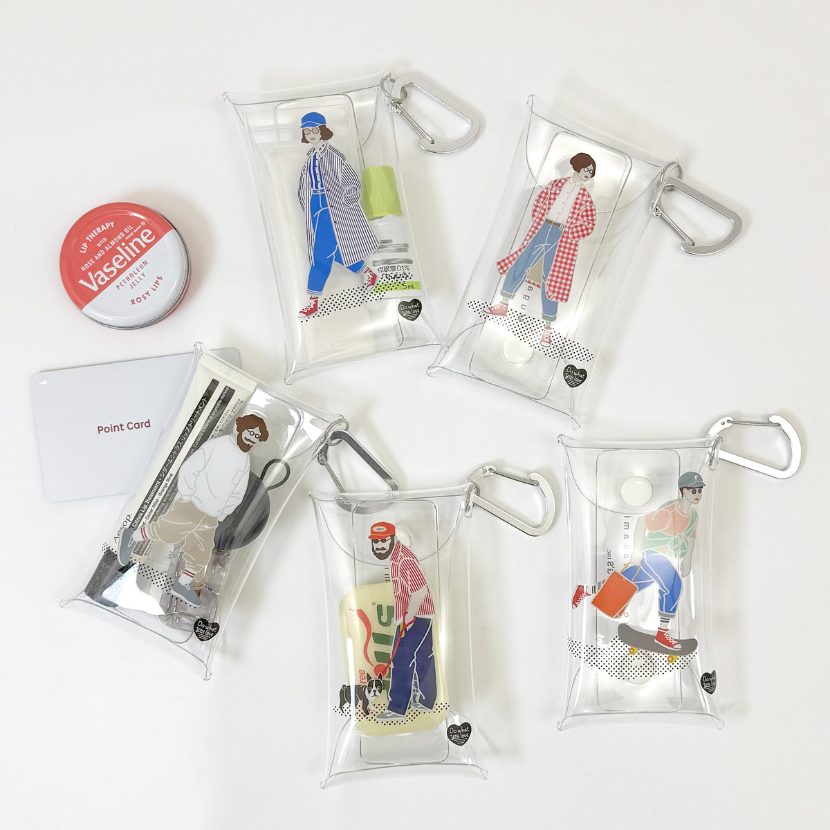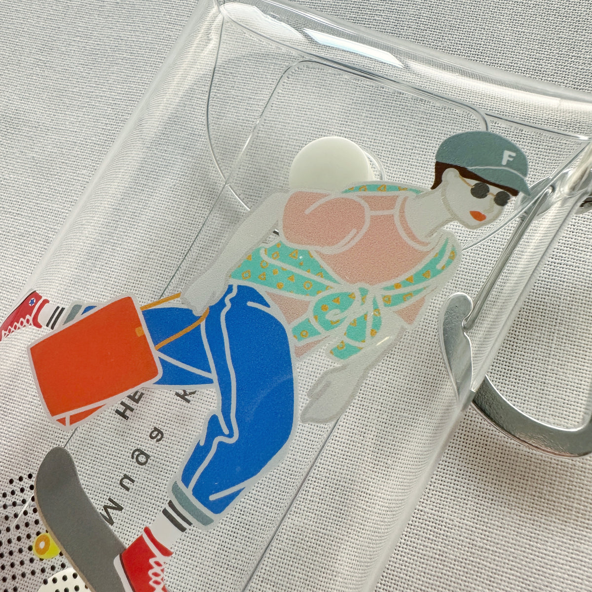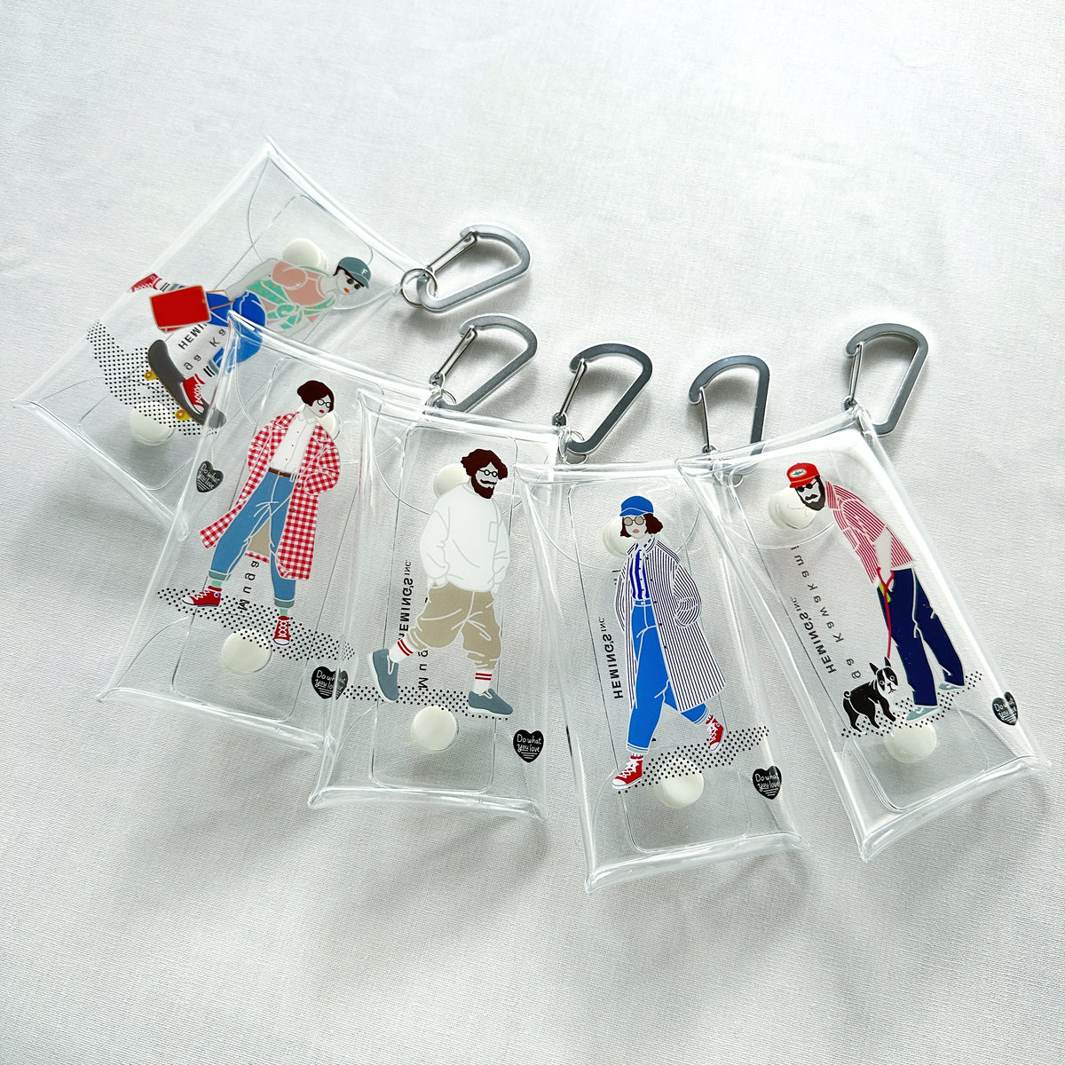 ユーモアのある日常を取り入れたファッションイラストを制作する、Muga Kawakamiの作品がプリントされた塩ビポーチ。