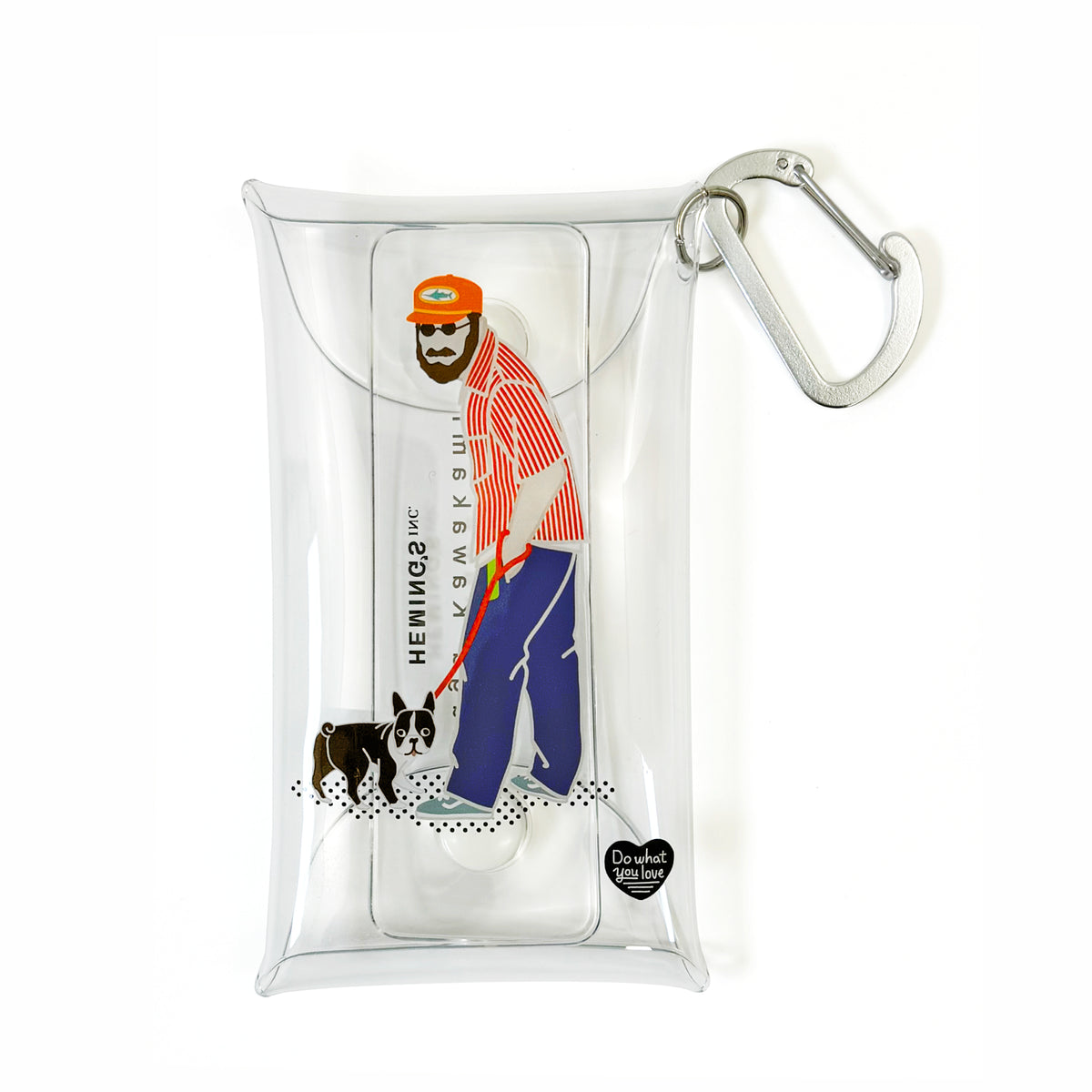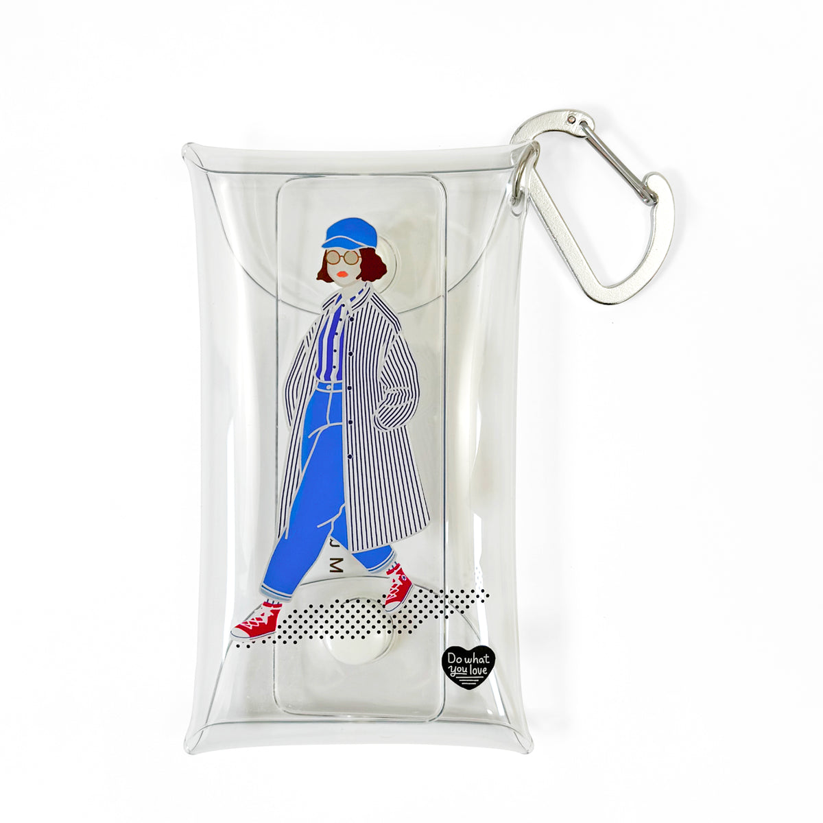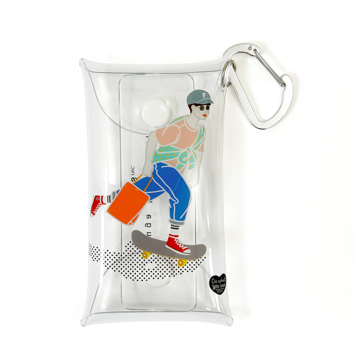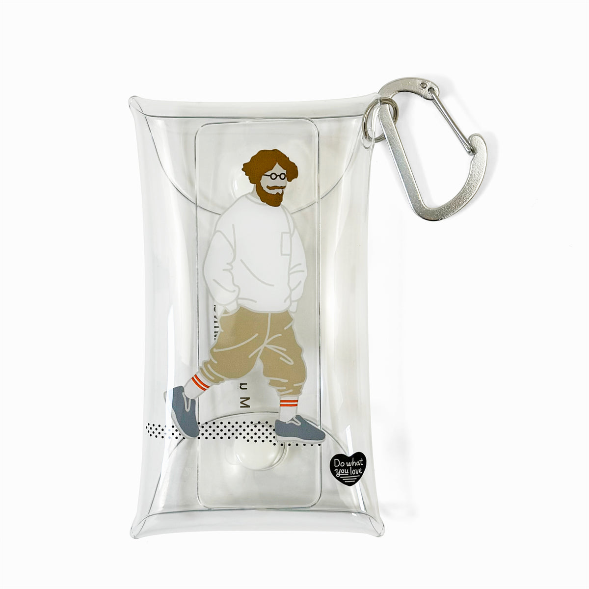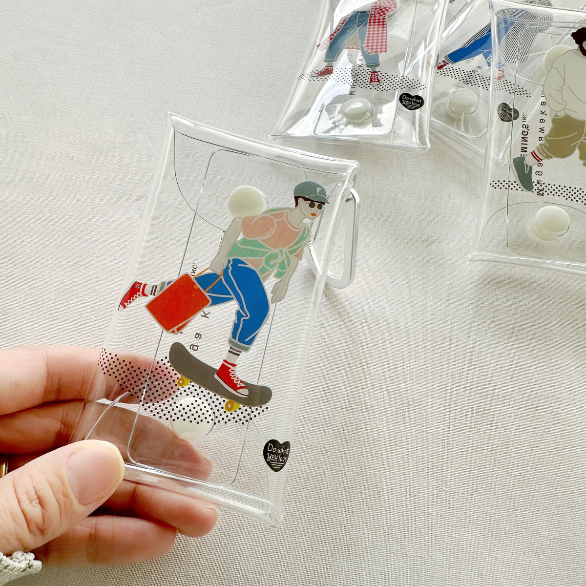 ユーモアのある日常を取り入れたファッションイラストを制作する、Muga Kawakamiの作品がプリントされた塩ビポーチ。