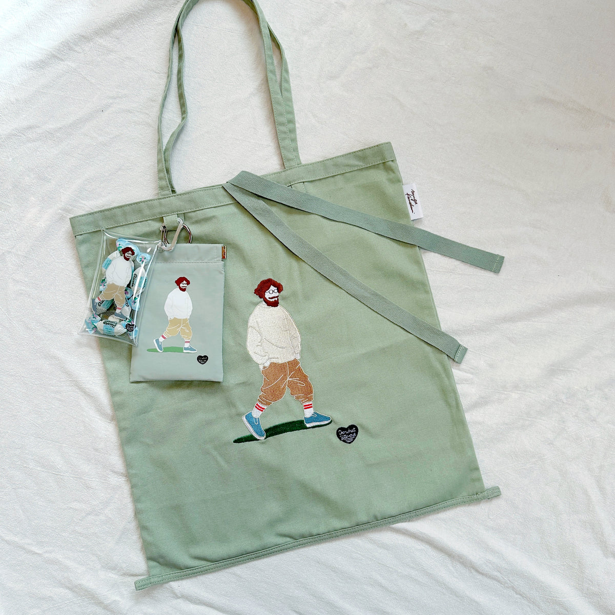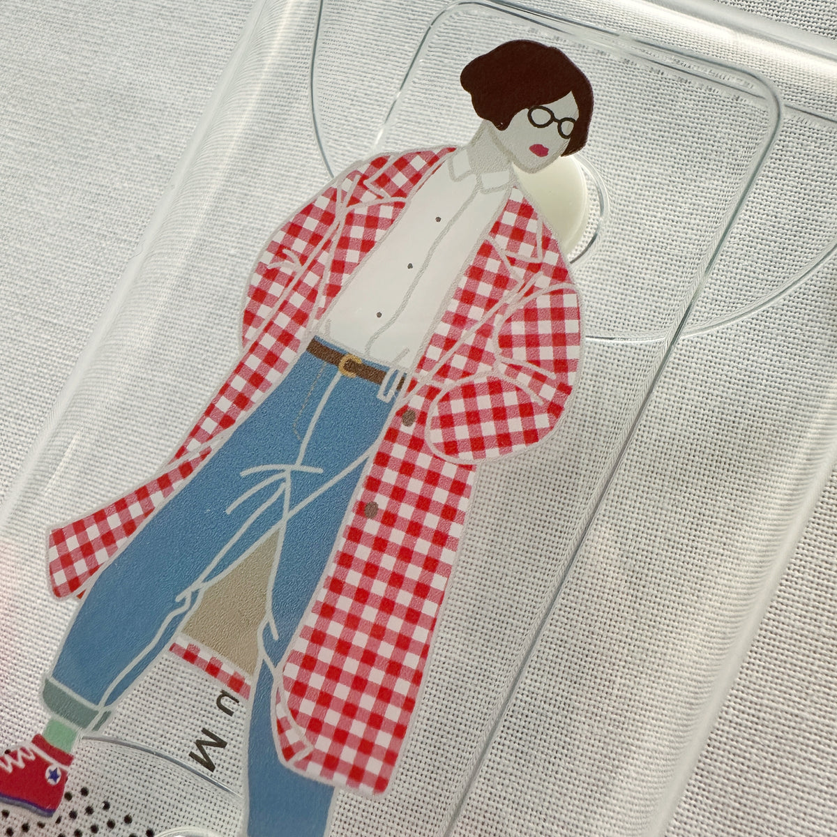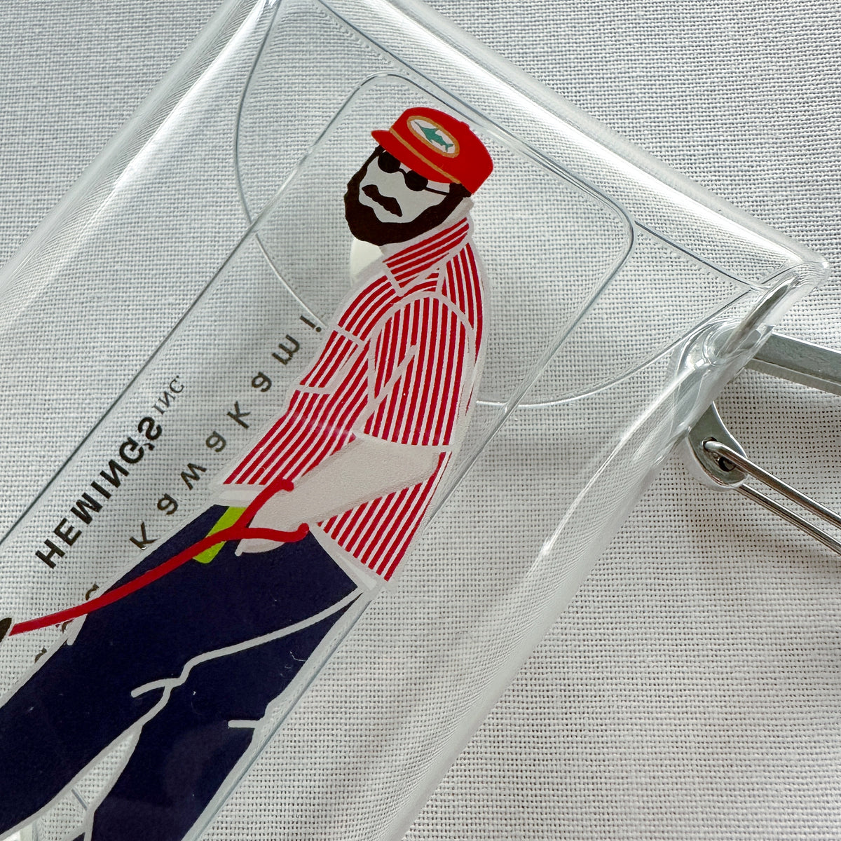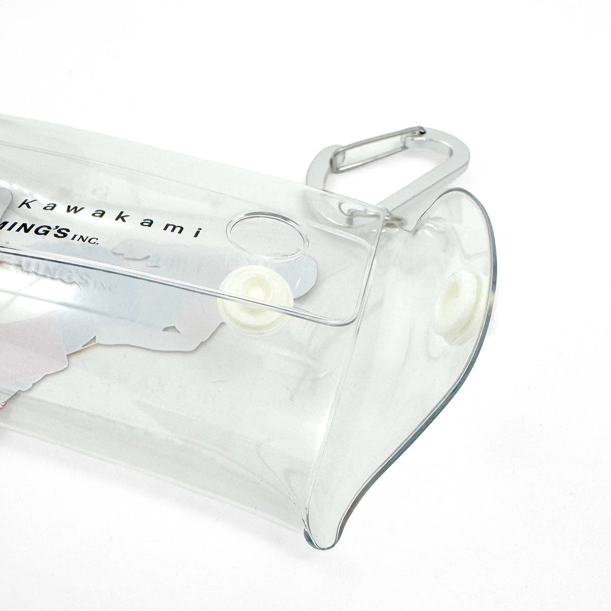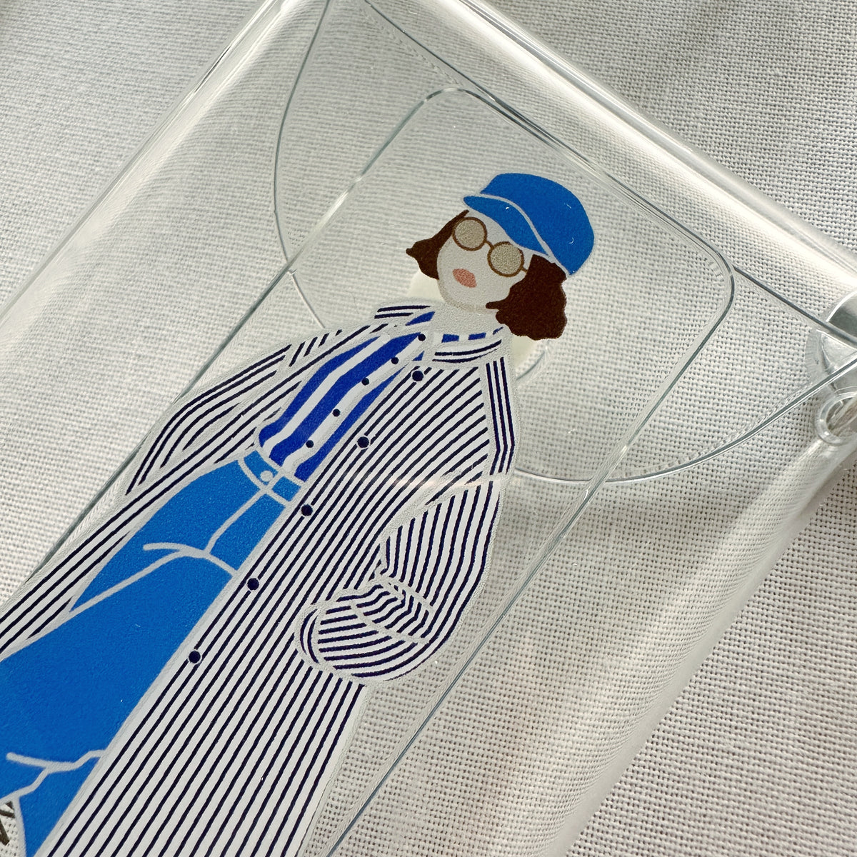 ユーモアのある日常を取り入れたファッションイラストを制作する、Muga Kawakamiの作品がプリントされた塩ビポーチ。