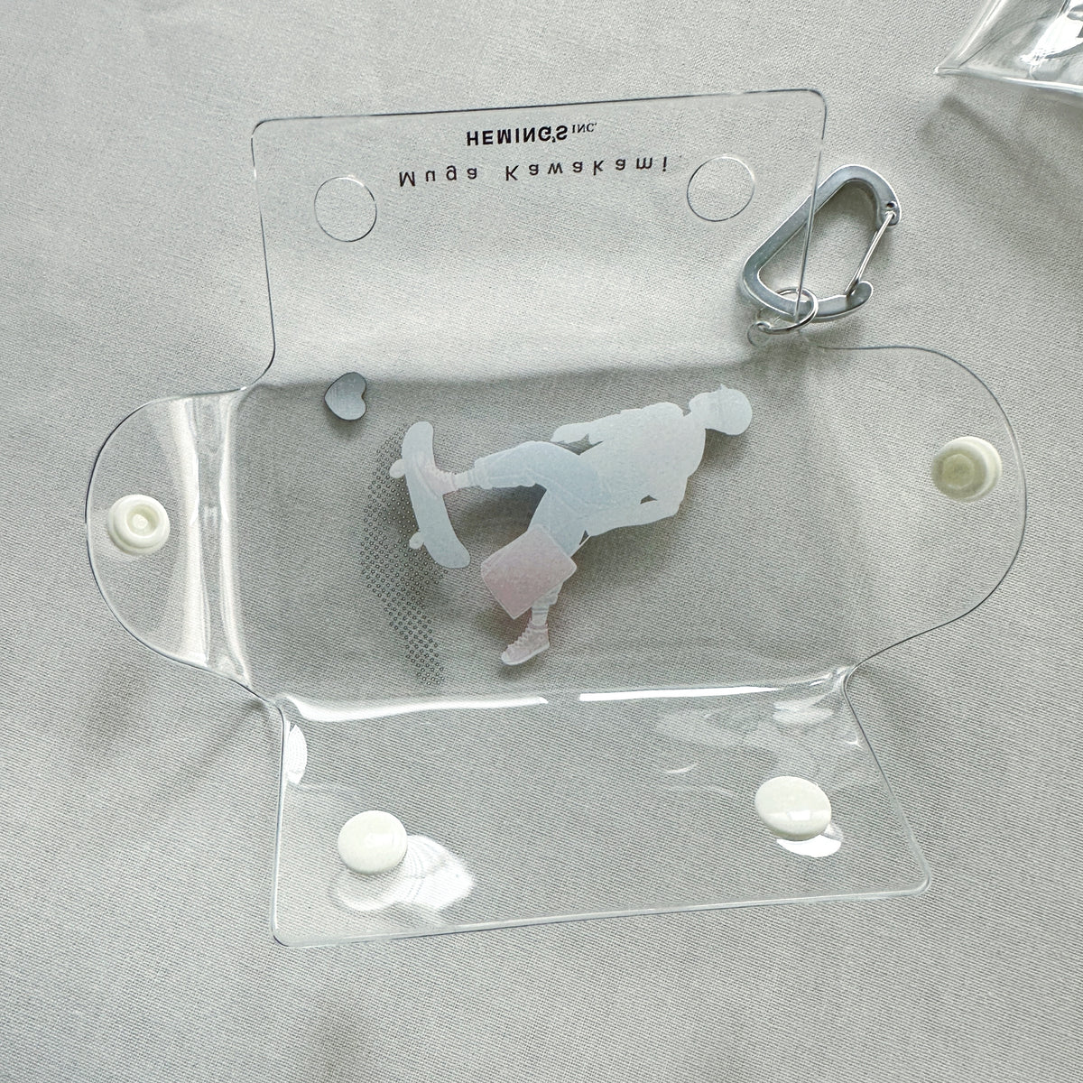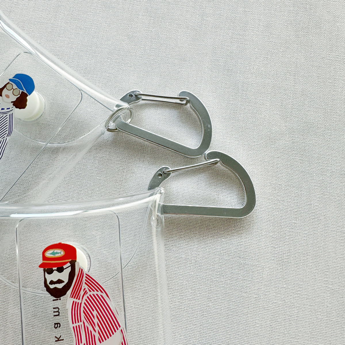 裏面のホックで開閉。カラビナ付きなので、バッグなどに付けることができます。
