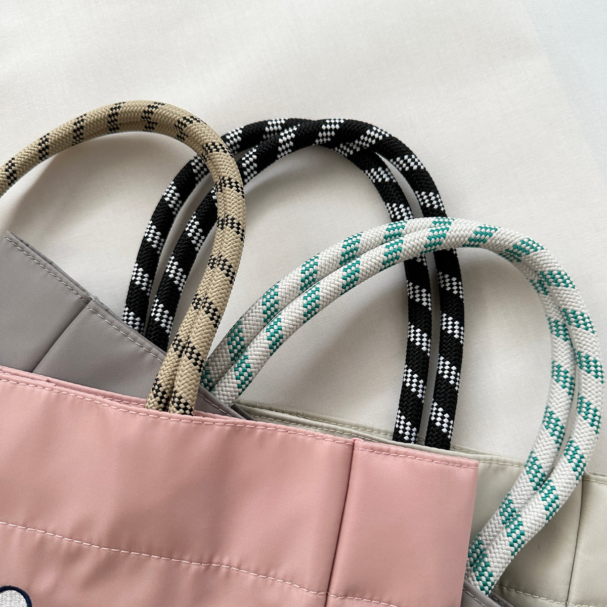 アウトドアロープのハンドルとフロントの大胆な刺繍がポイントのトートバッグ。バッグを開いた時にチラリと見える総柄の裏地が可愛いです。 しっかりとマチがある商品なので見た目以上に荷物を入れることができます。