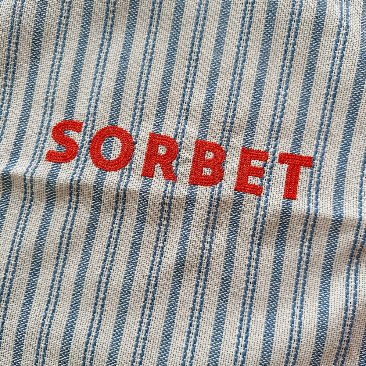 焼きたてのブリオッシュ、香り高いスパイス、宝石のようなテリーヌ、ひんやり冷たいソルベ。フランスの食材店に並んでいそうな食べ物の名前を立体感のあるチェーンステッチで刺繍しています