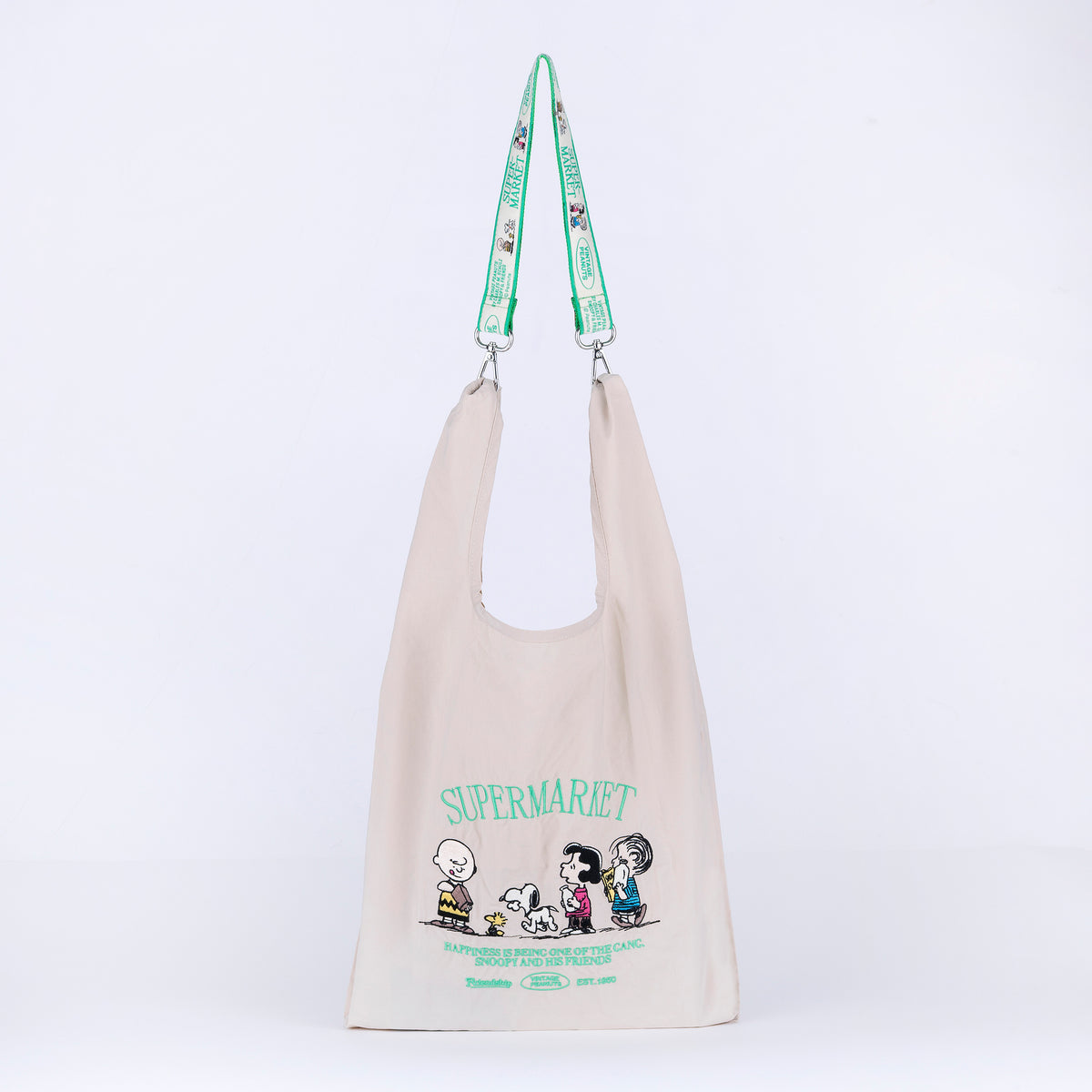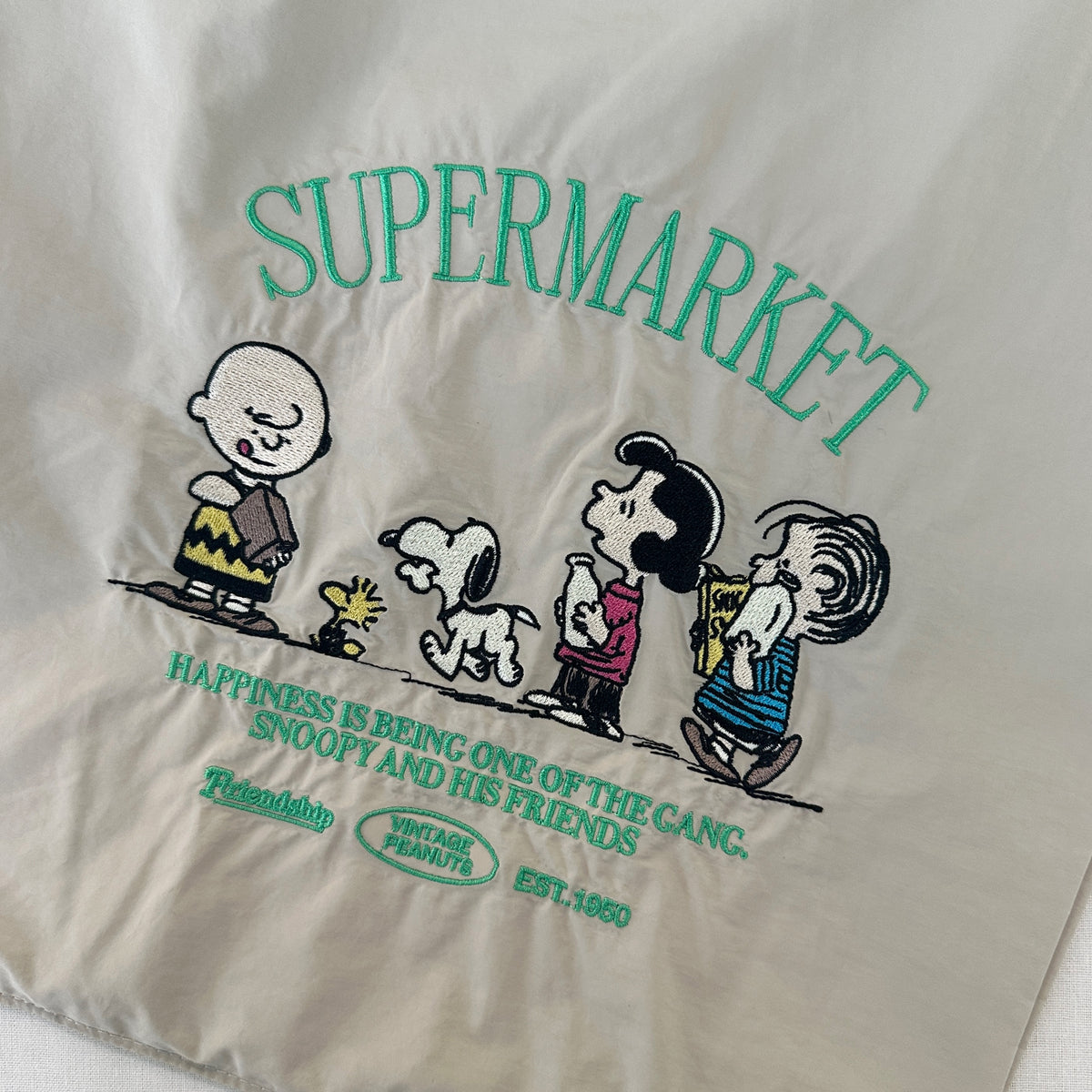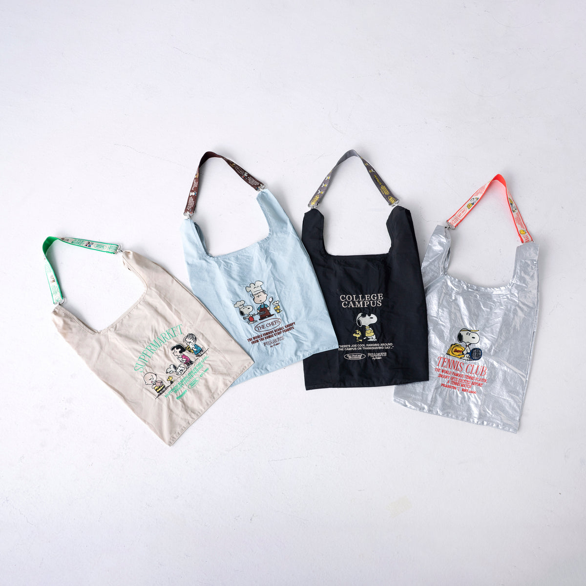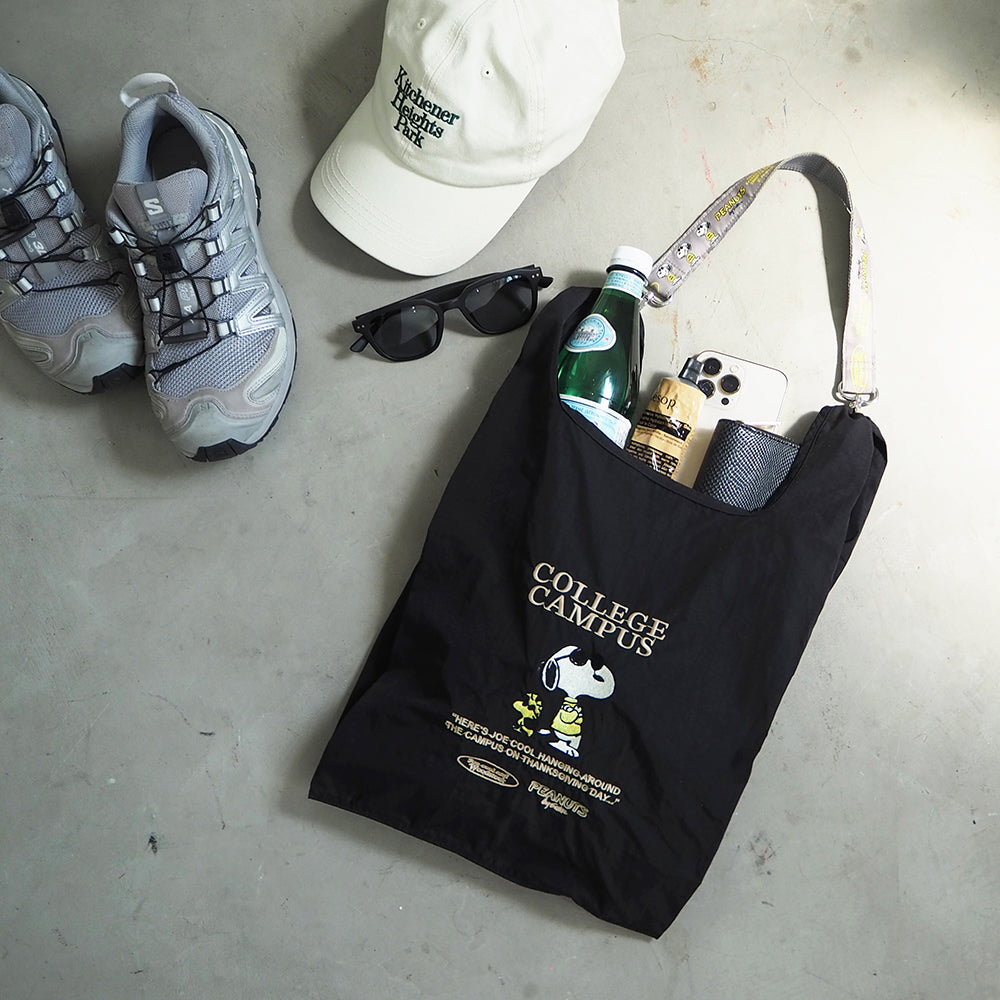 PEANUTSのキャッチーな刺繍が施されたデザイン。全4柄。