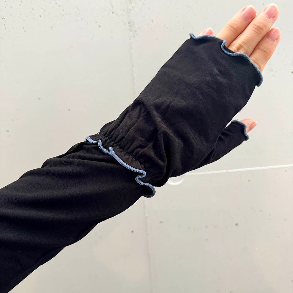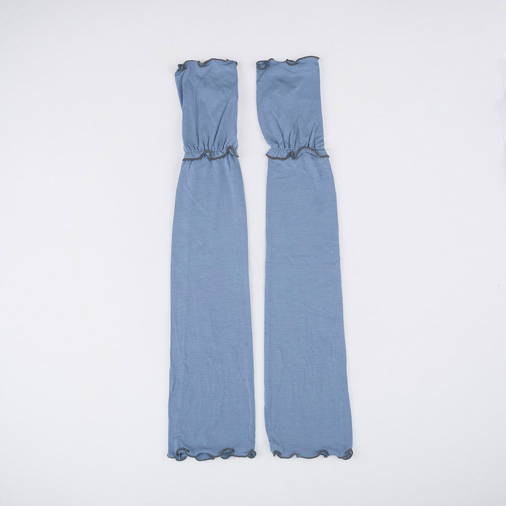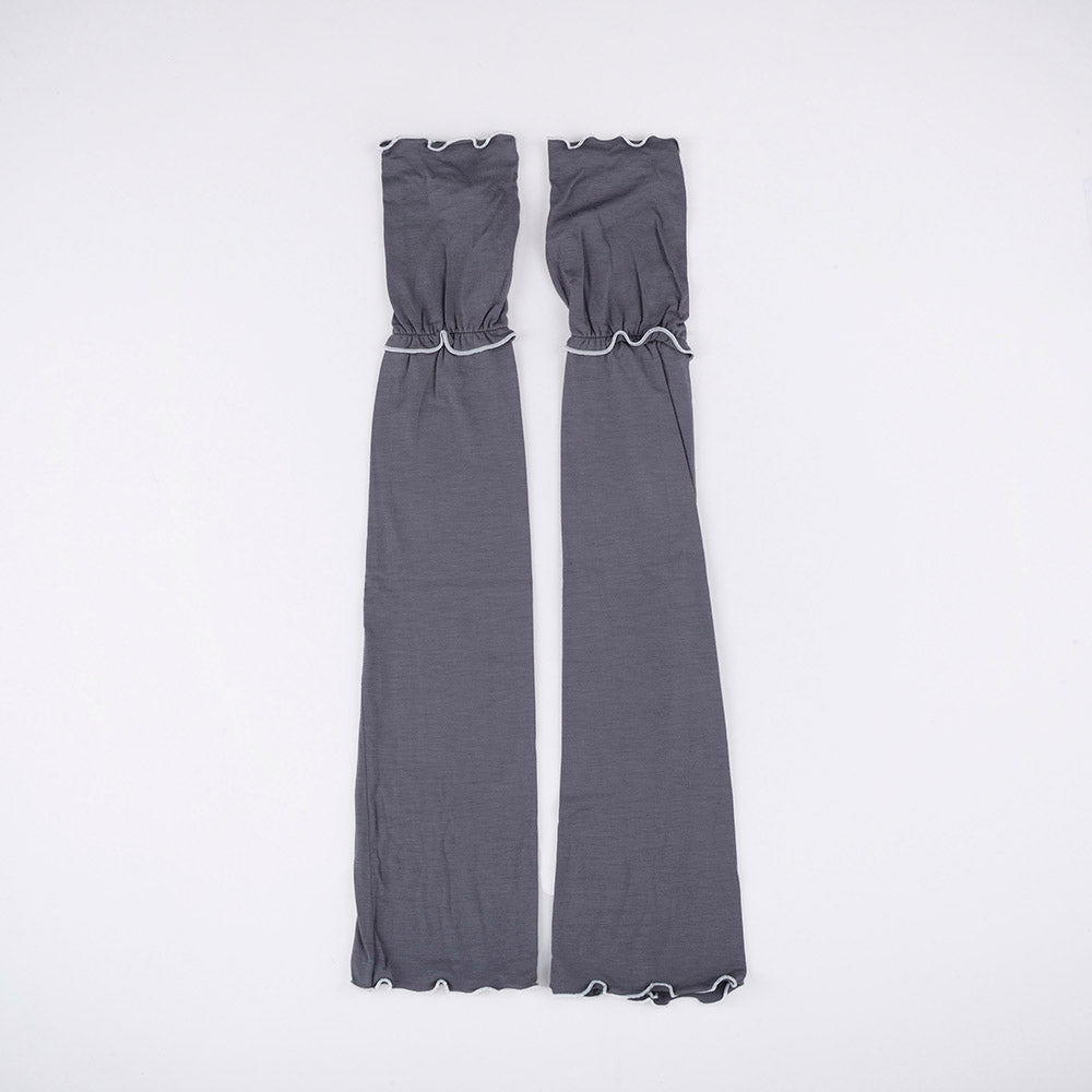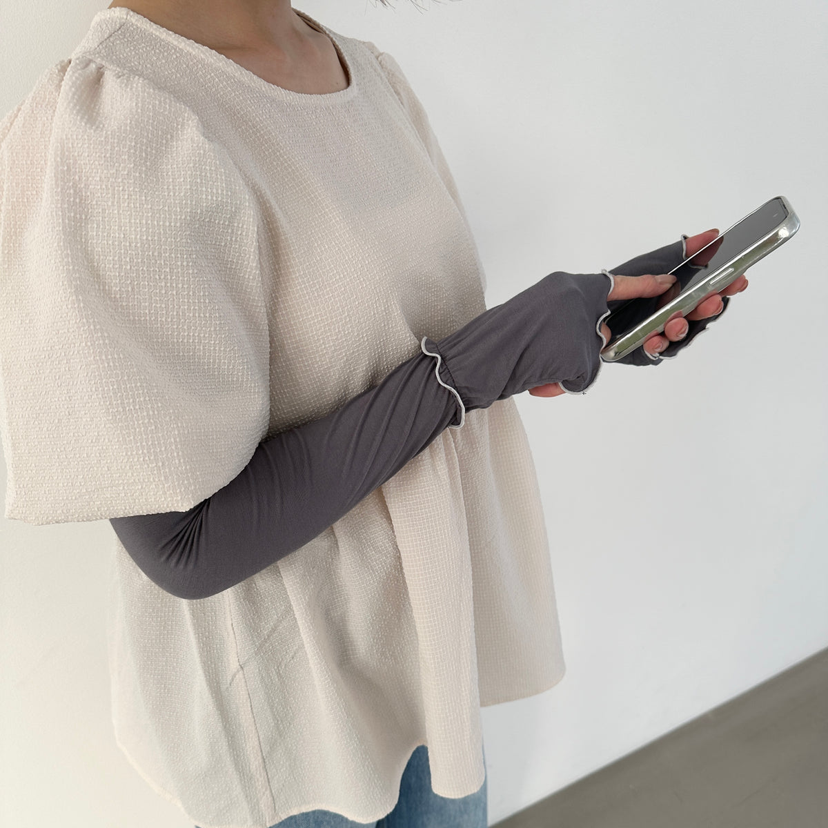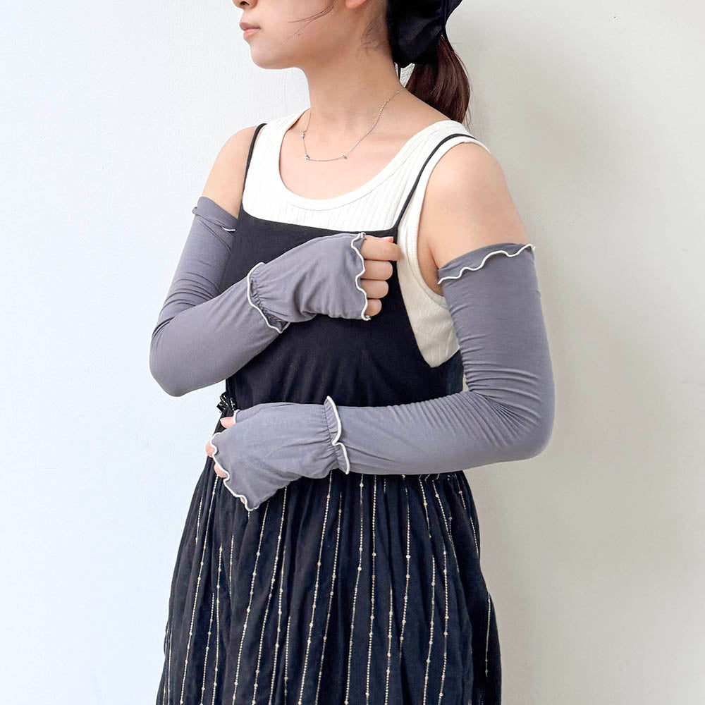 接触冷感&UVケア機能を備えた、夏の外出に頼れるアームカバー。さりげない配色のメロー加工でほんのりフェミニンな印象に仕上げました。大人のカジュアルスタイルにも合わせやすいデザインです。