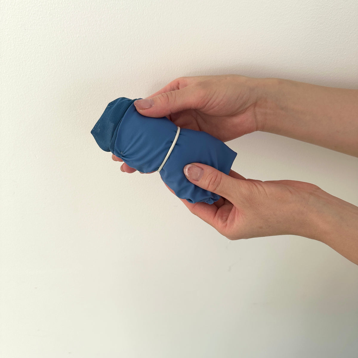 二の腕のゴムバンドを使えば、くるくる丸めてコンパクトに持ち運びできます