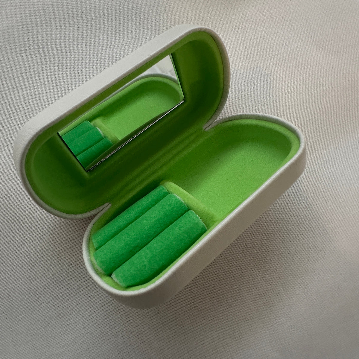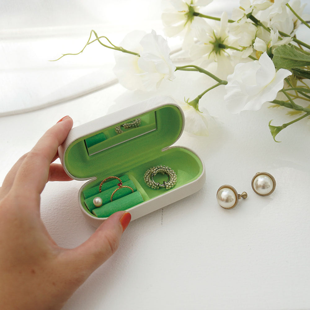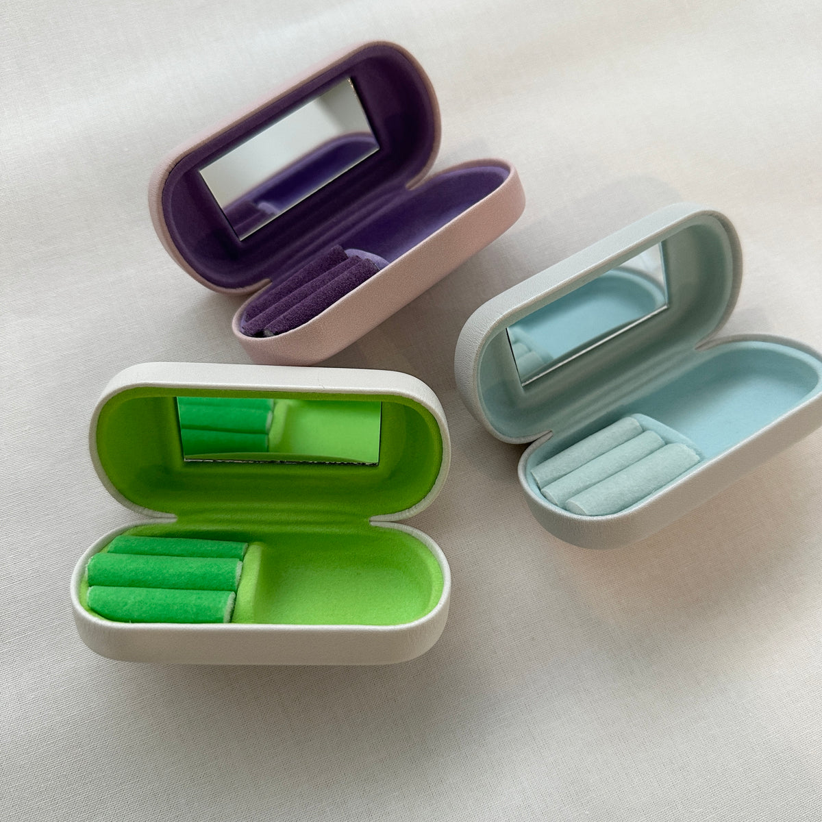内側は細めの指輪や小さめのピアスが固定できる仕様なので、持ち運びの際にアクセサリー同士がぶつからず傷ができるのを防ぎます。