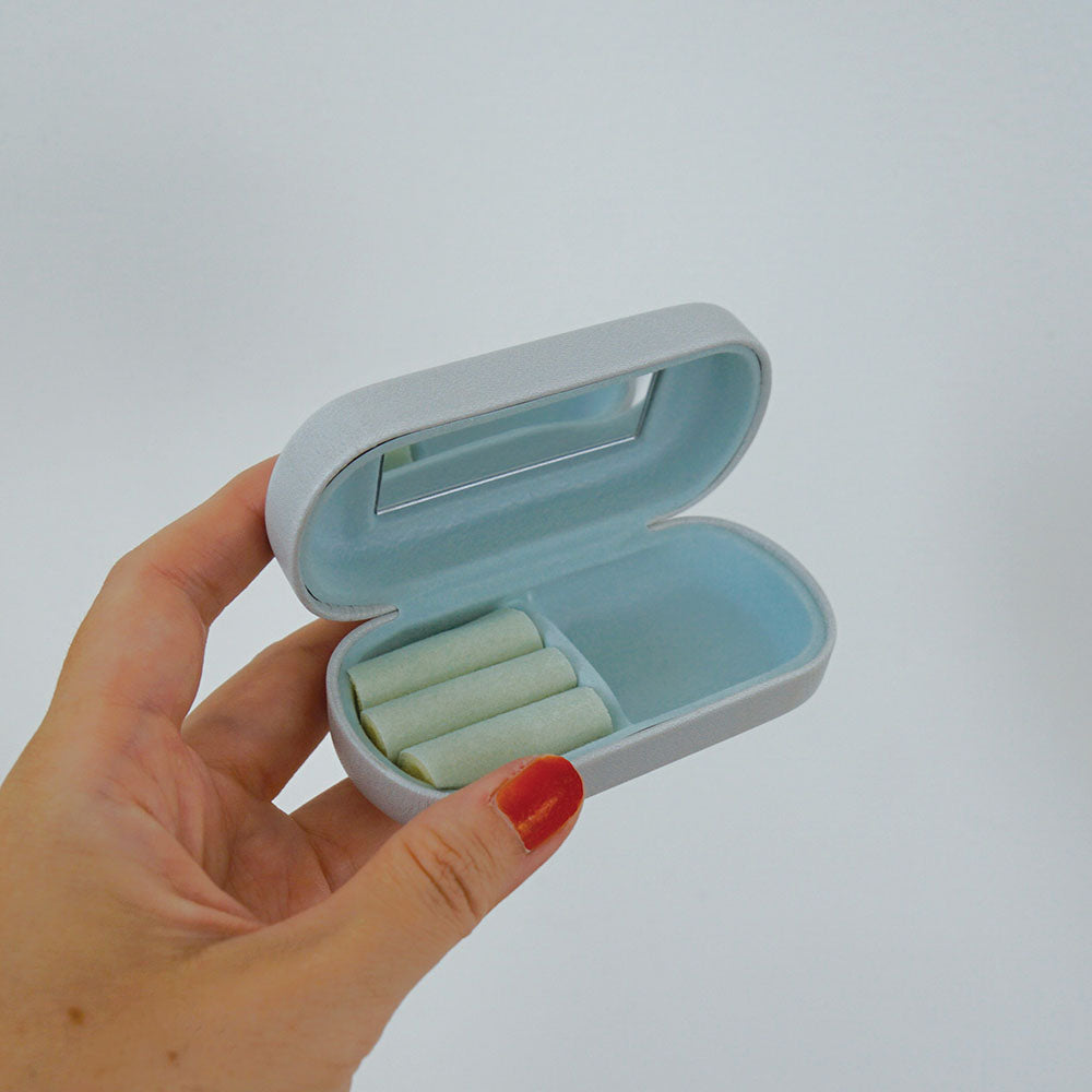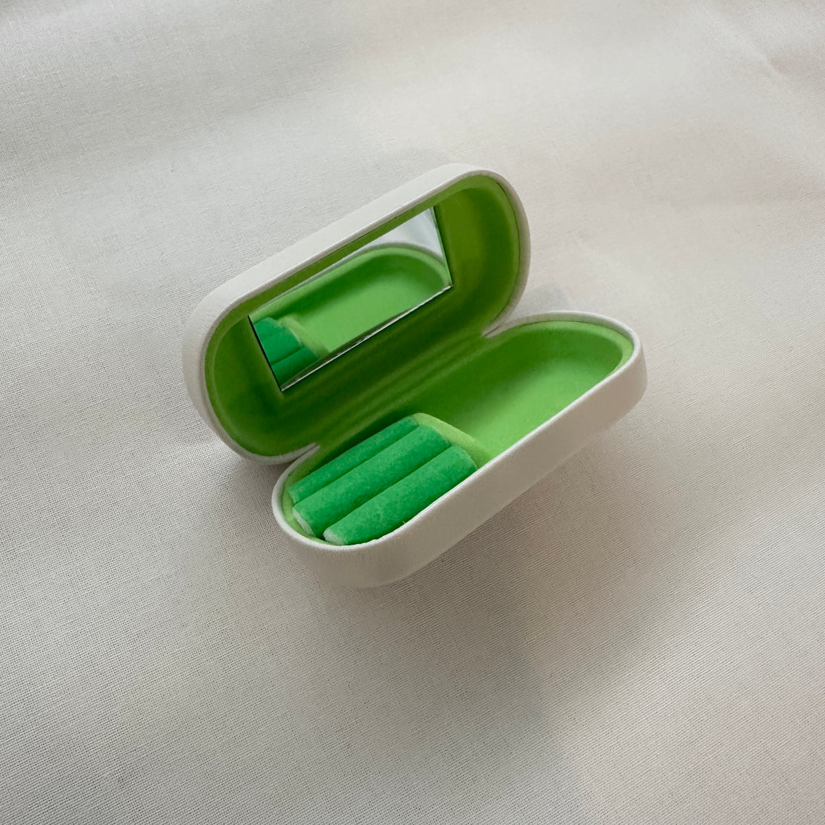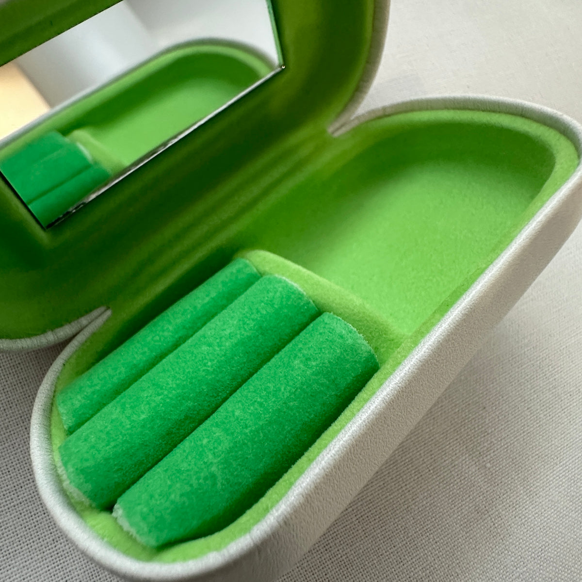 内側は細めの指輪や小さめのピアスが固定できる仕様なので、持ち運びの際にアクセサリー同士がぶつからず傷ができるのを防ぎます。