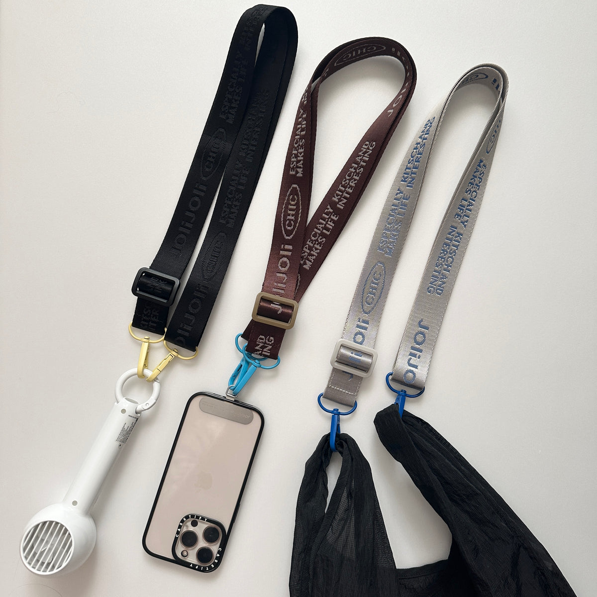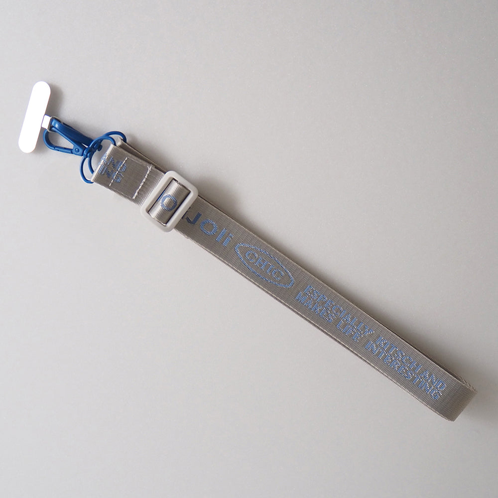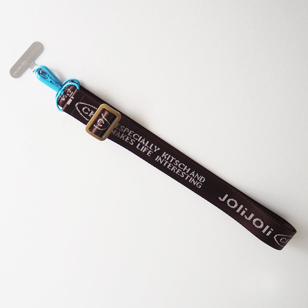JOliJOliのロゴをデザインしたシンプルなストラップ。パーツ部分のカラーがアクセントになる全3色展開です。ストラップを取り付けられるパーツが付いていれば、お手持ちのお財布、 ポーチ、折りたたみ傘、ハンディーファンなどにも取り付けることができる優れもの。