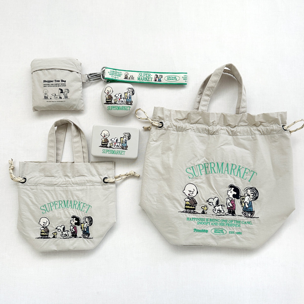 保冷巾着トートやストラップ付きショッパーバッグと連動した “SUPERMARKET”と“TENNIS”のデザイン。
