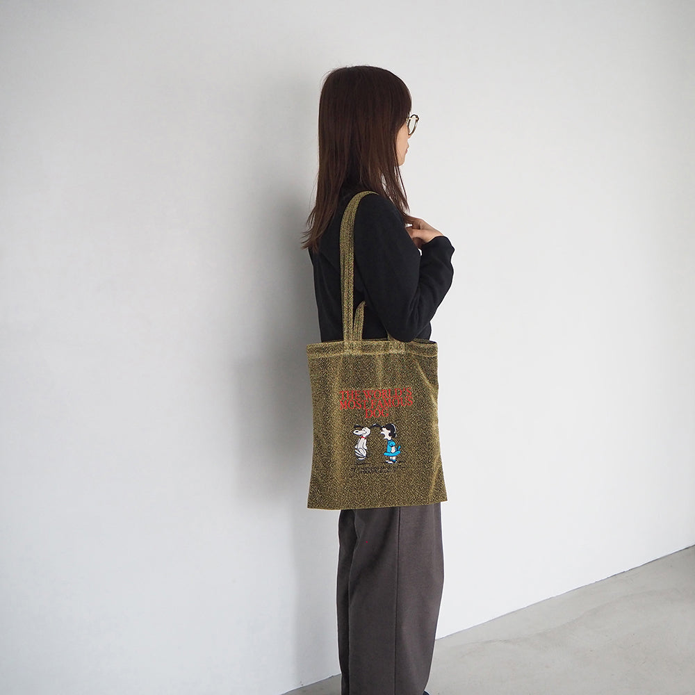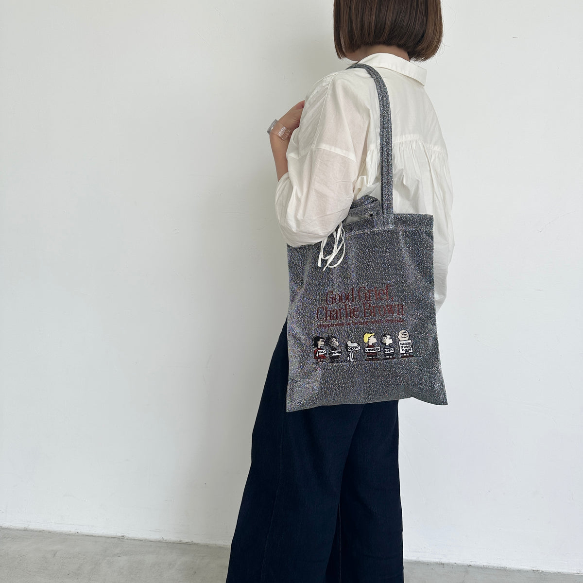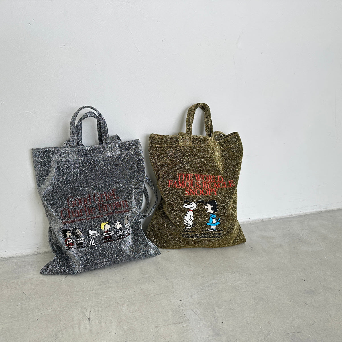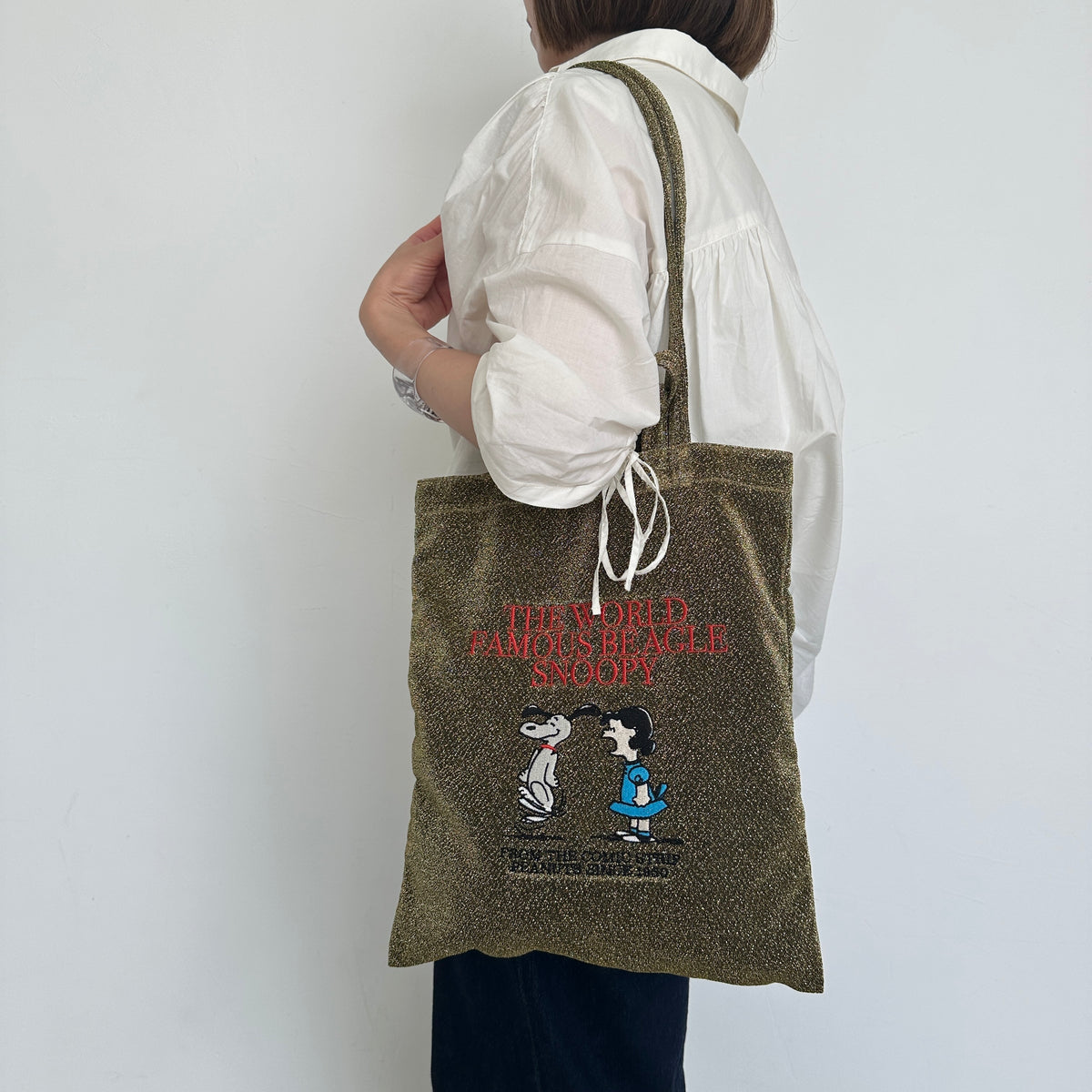 トレンドのラメ生地のバッグにPEANUTSの1950年代のアート刺繍を施したフラットトートが新登場! ダブルハンドルなので2WAYで使えて便利な仕様。お出かけに便利なフラットトートです。
