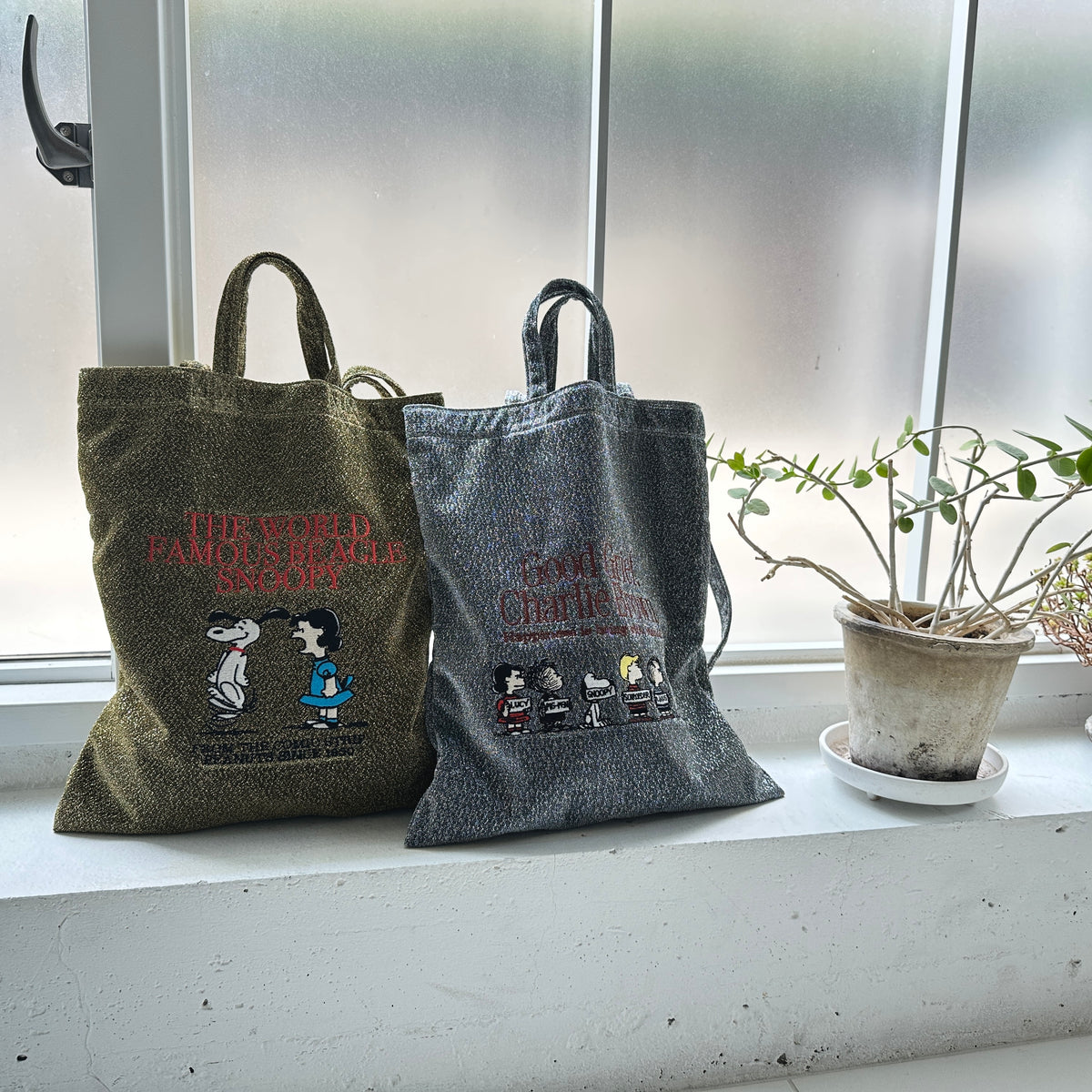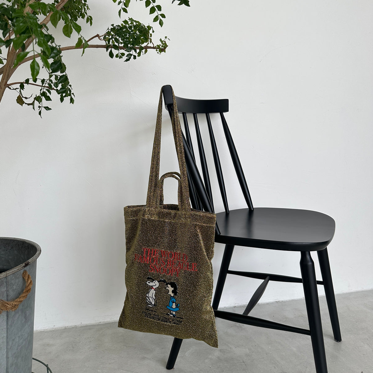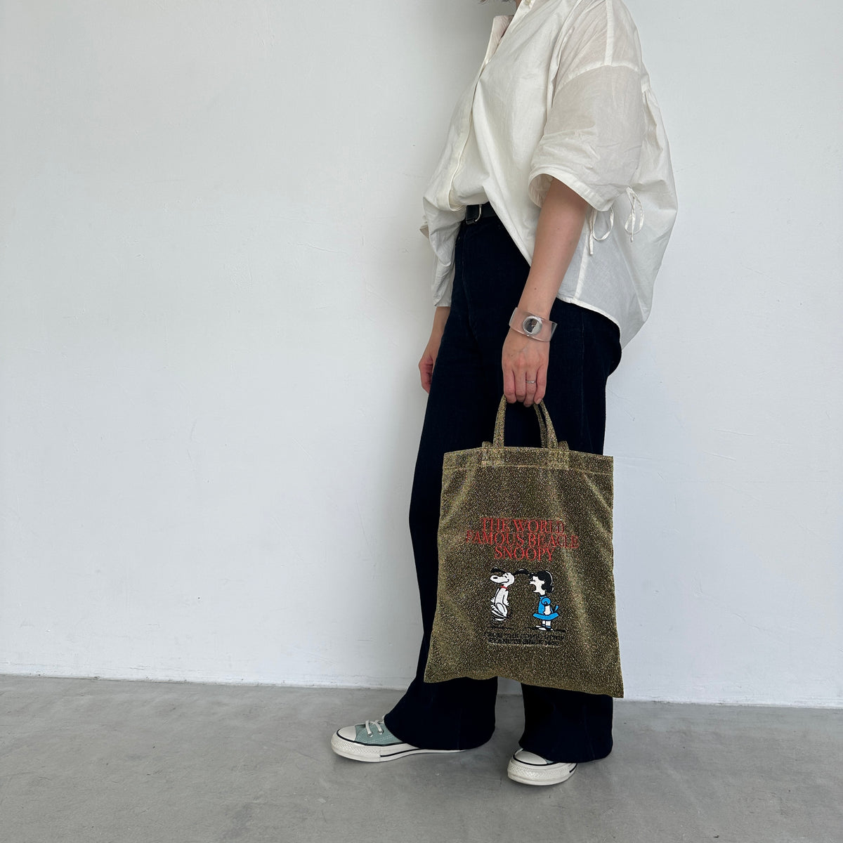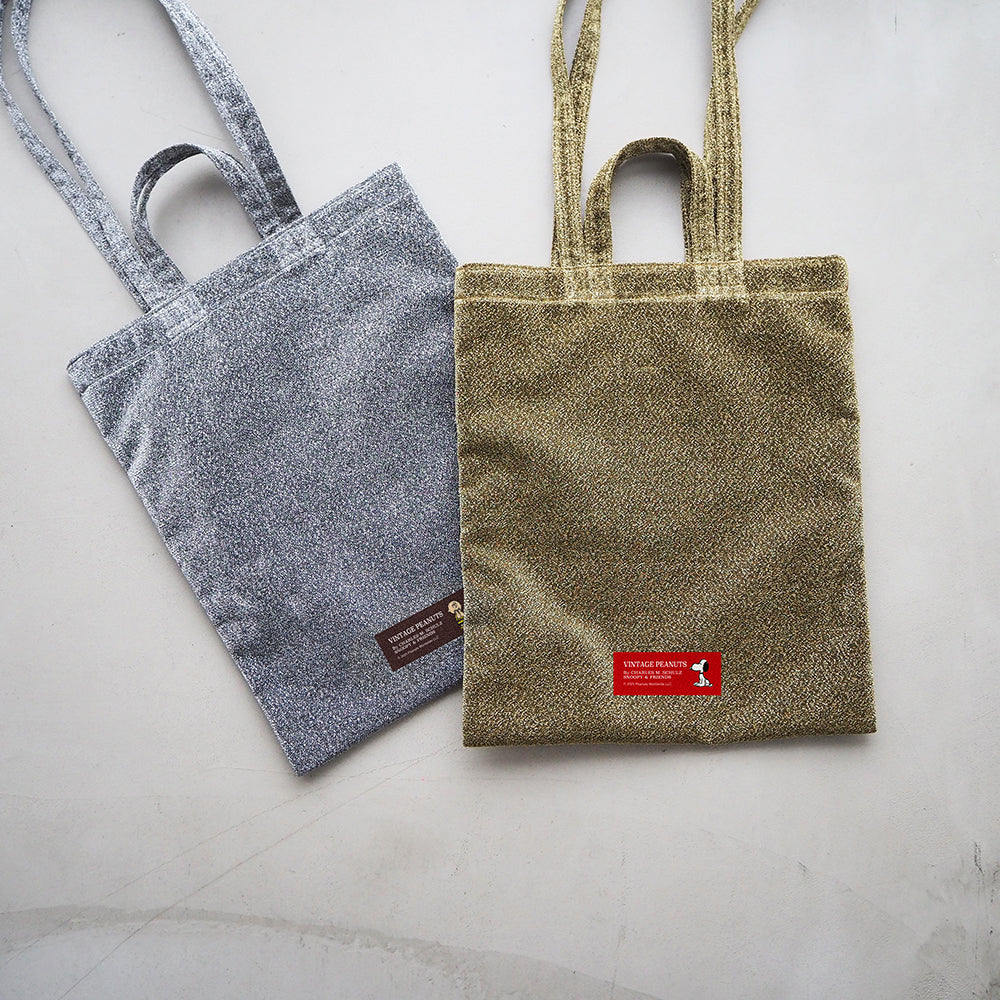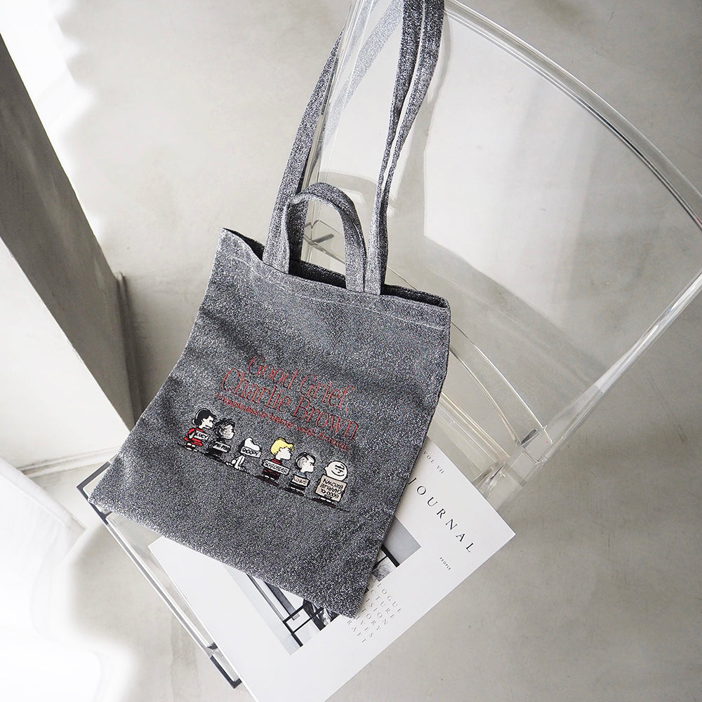 トレンドのラメ生地のバッグにPEANUTSの1950年代のアート刺繍を施したフラットトートが新登場! ダブルハンドルなので2WAYで使えて便利な仕様。お出かけに便利なフラットトートです。