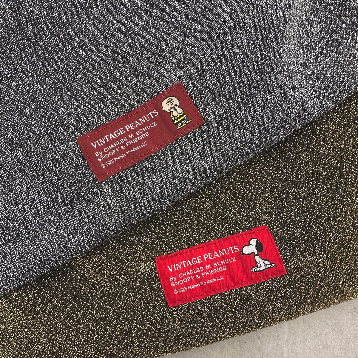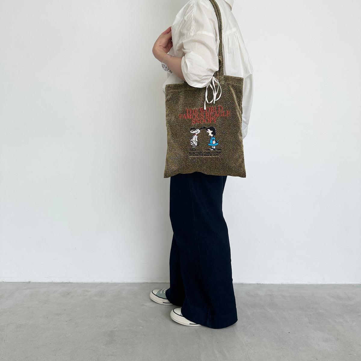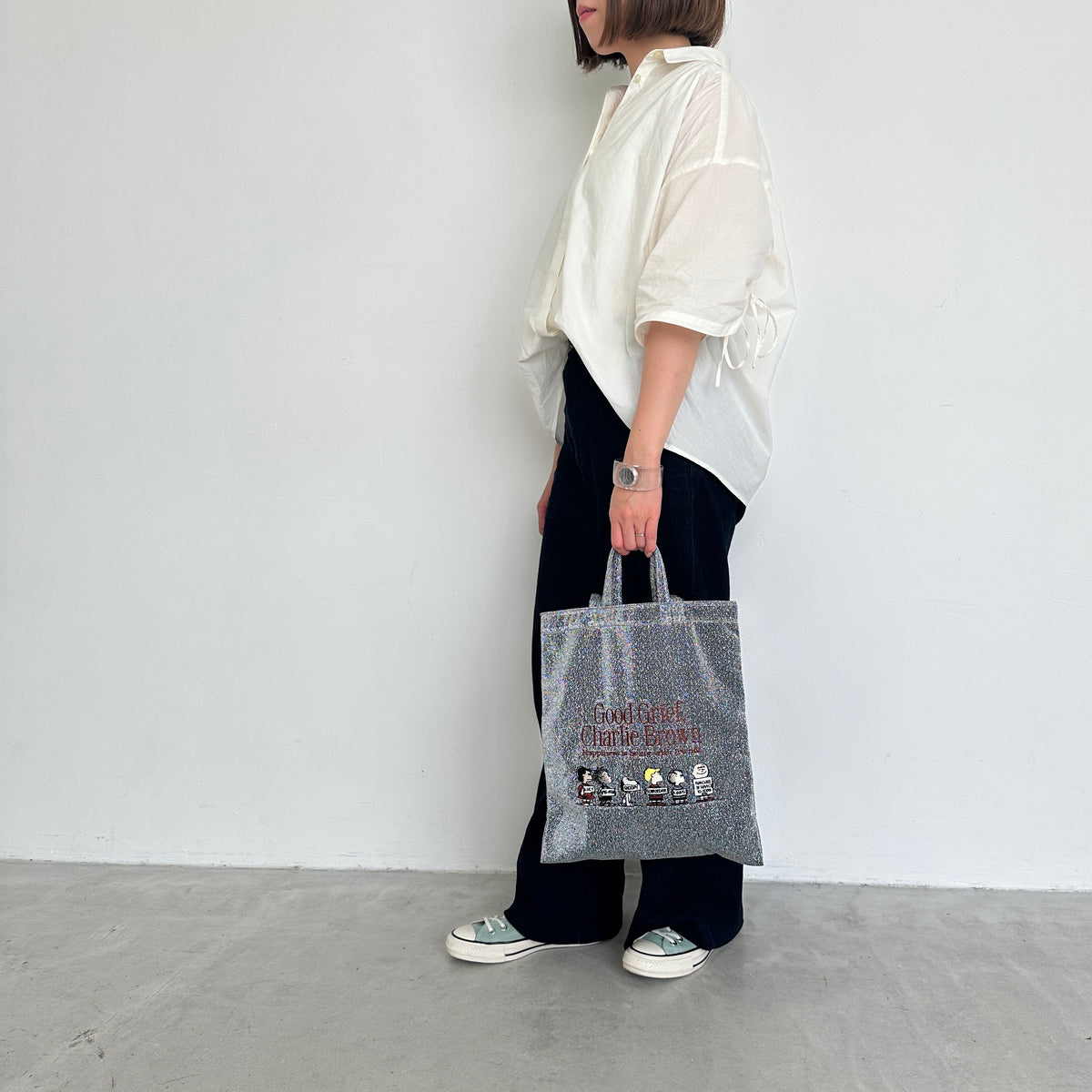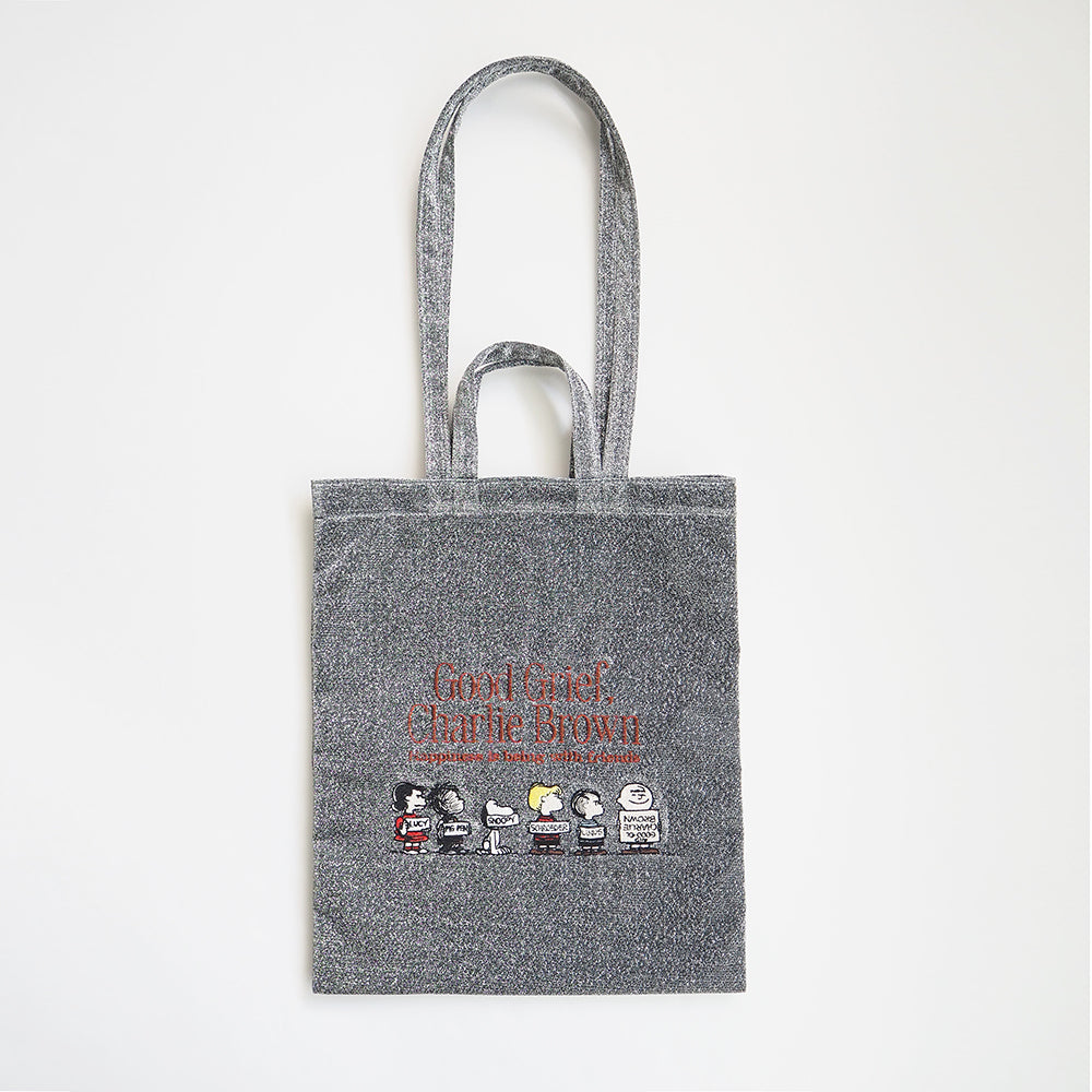 トレンドのラメ生地のバッグにPEANUTSの1950年代のアート刺繍を施したフラットトートが新登場! ダブルハンドルなので2WAYで使えて便利な仕様。お出かけに便利なフラットトートです。