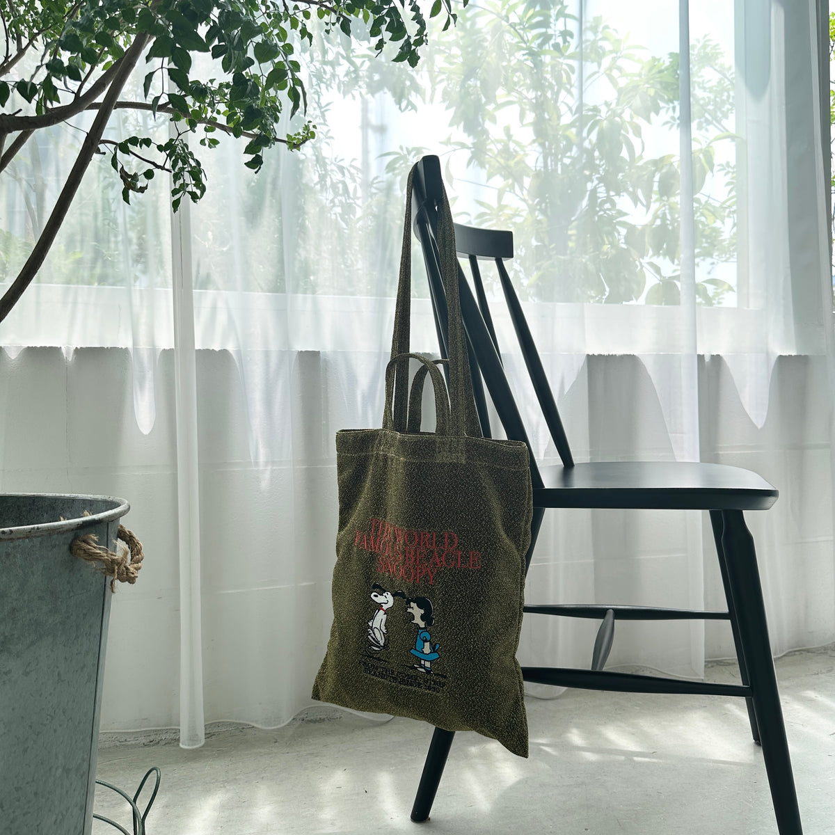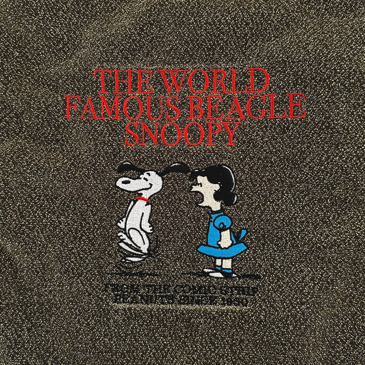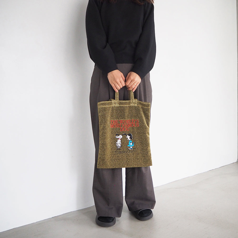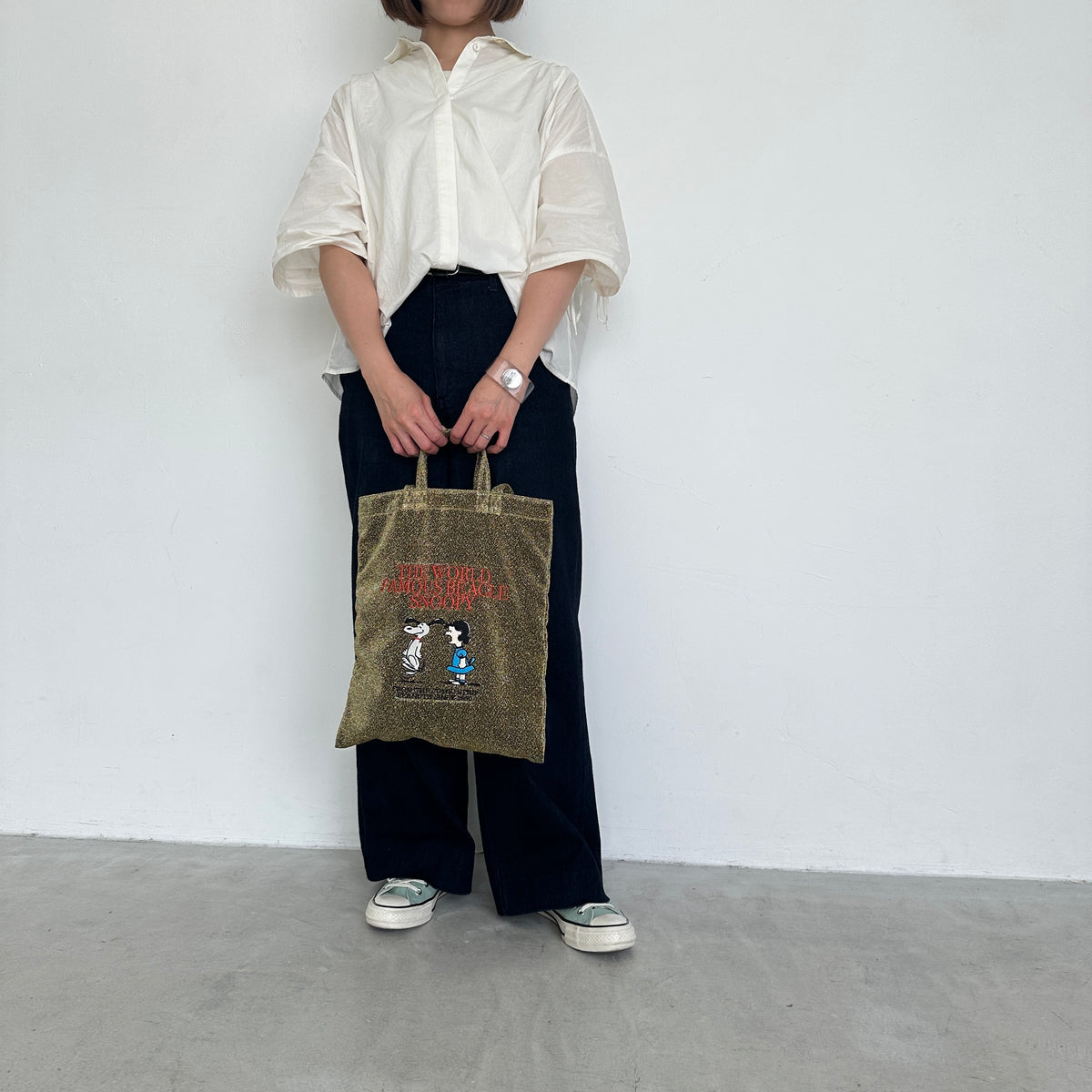 トレンドのラメ生地のバッグにPEANUTSの1950年代のアート刺繍を施したフラットトートが新登場! ダブルハンドルなので2WAYで使えて便利な仕様。お出かけに便利なフラットトートです。
