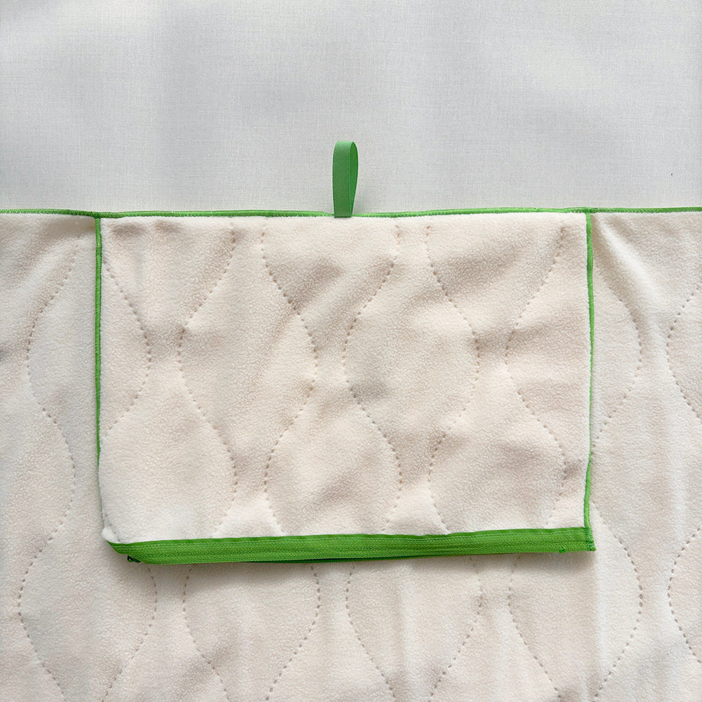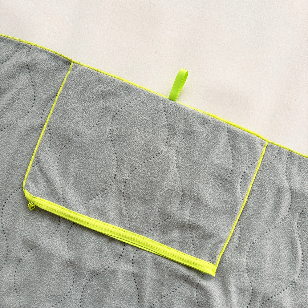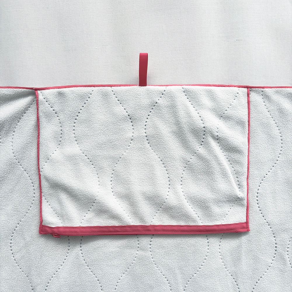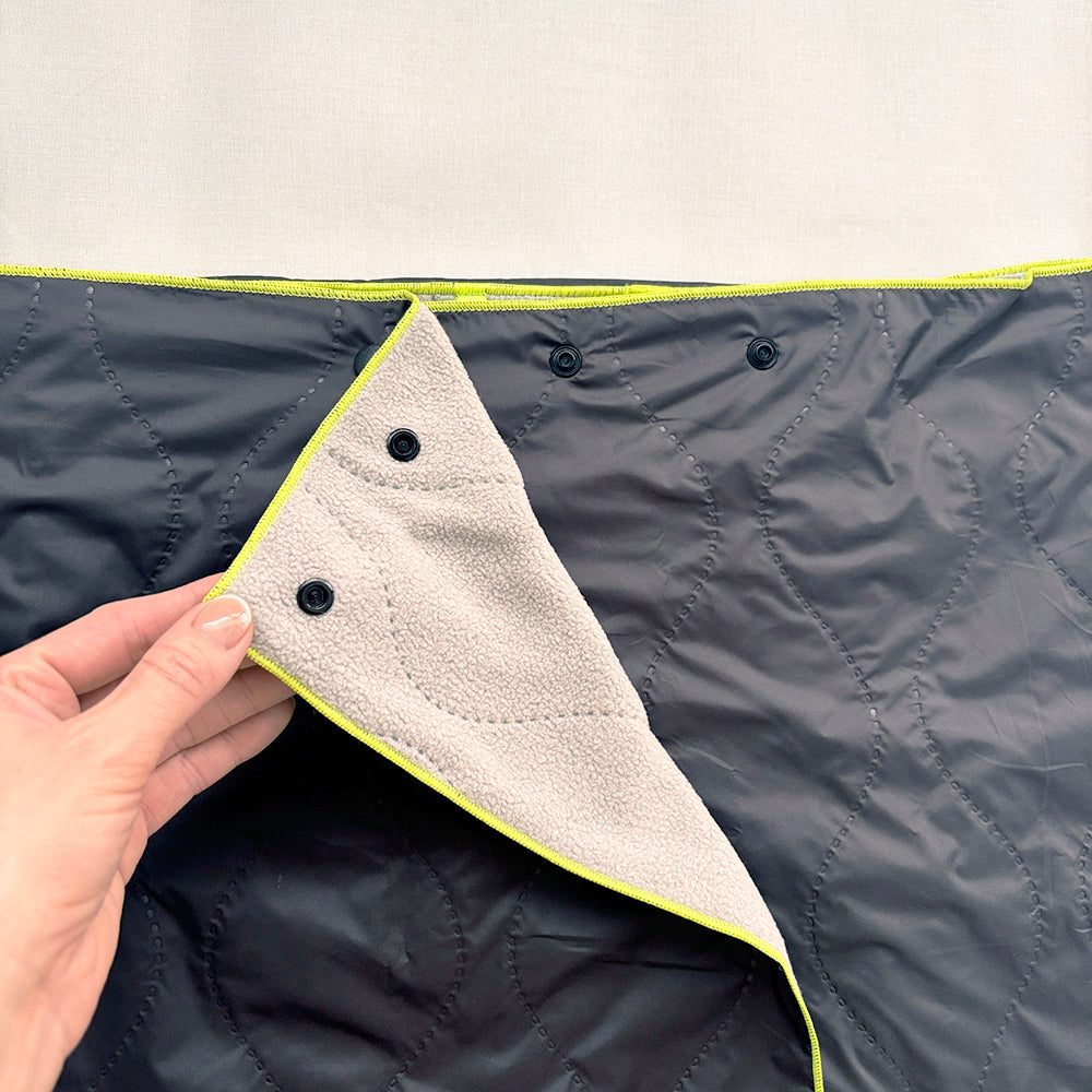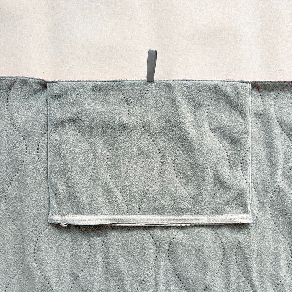 内側は発熱フリースを使用。ふわっとした手触りで暖かいです。肩やひざからかけた際に滑り落ちにくく、静電防止加工もされています。