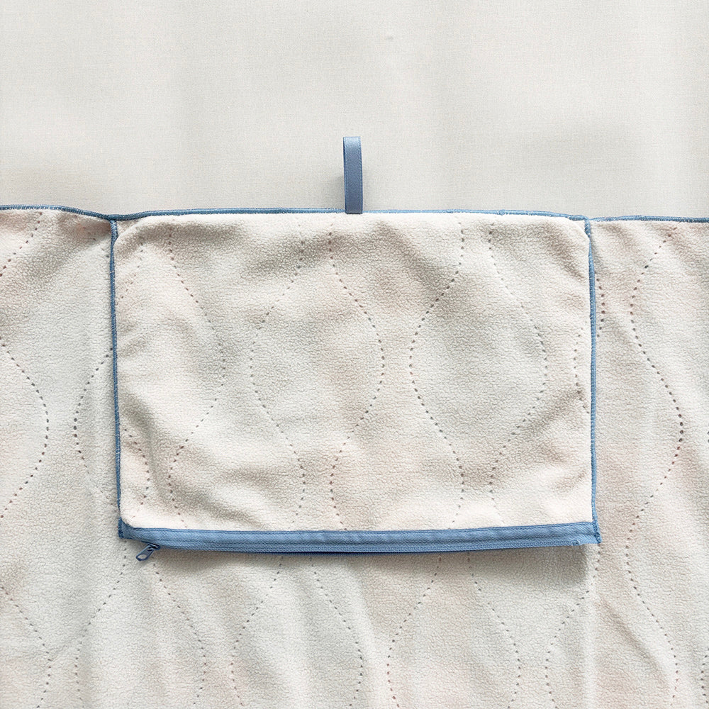 内側は発熱フリースを使用。ふわっとした手触りで暖かいです。肩やひざからかけた際に滑り落ちにくく、静電防止加工もされています。