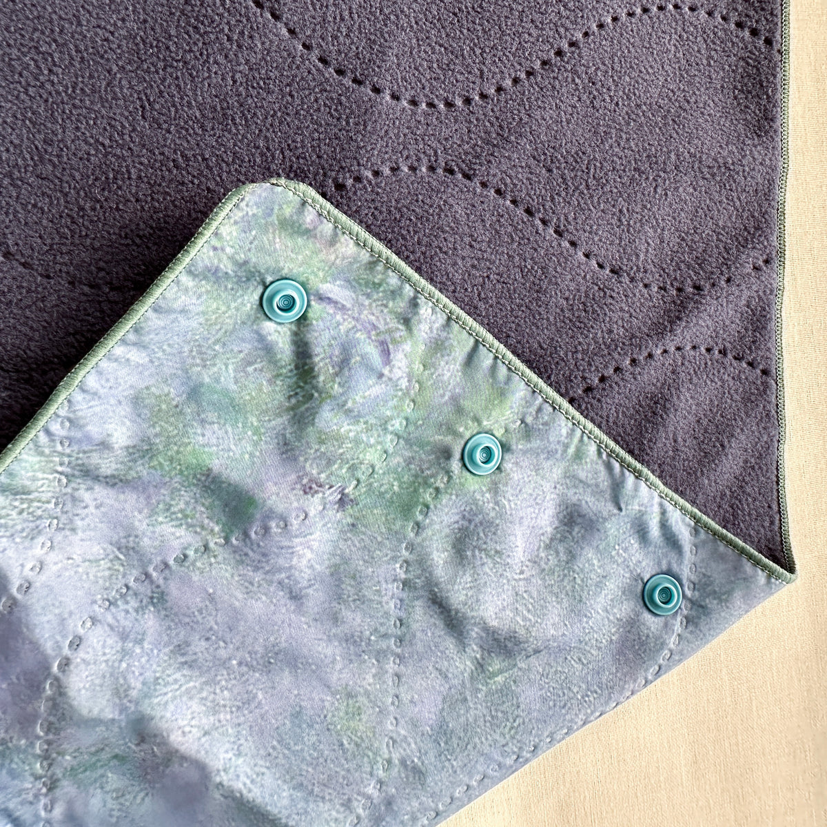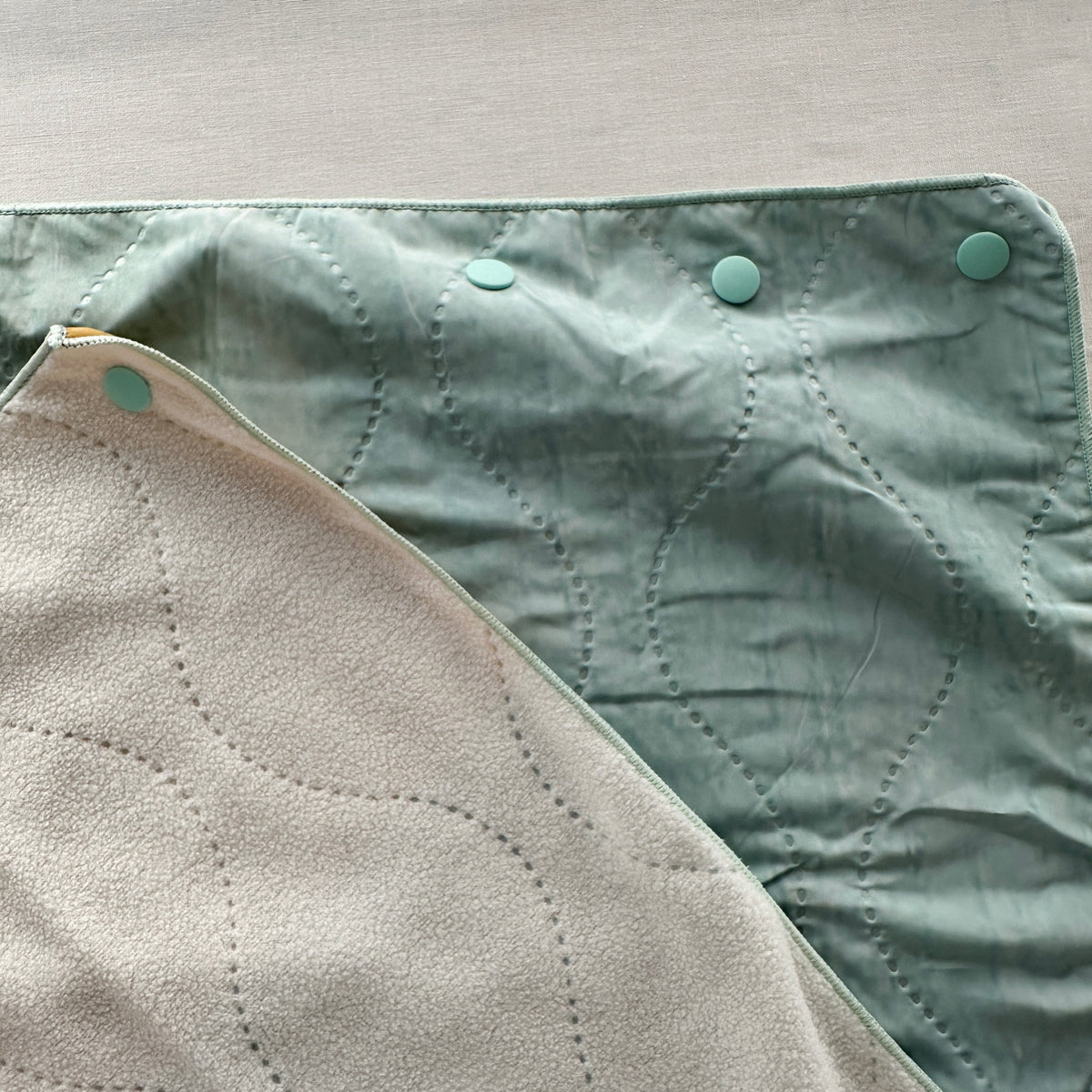 内側は発熱フリースを使用。ふわっとした手触りで暖かいです。肩やひざからかけた際に滑り落ちにくく、静電防止加工もされています。