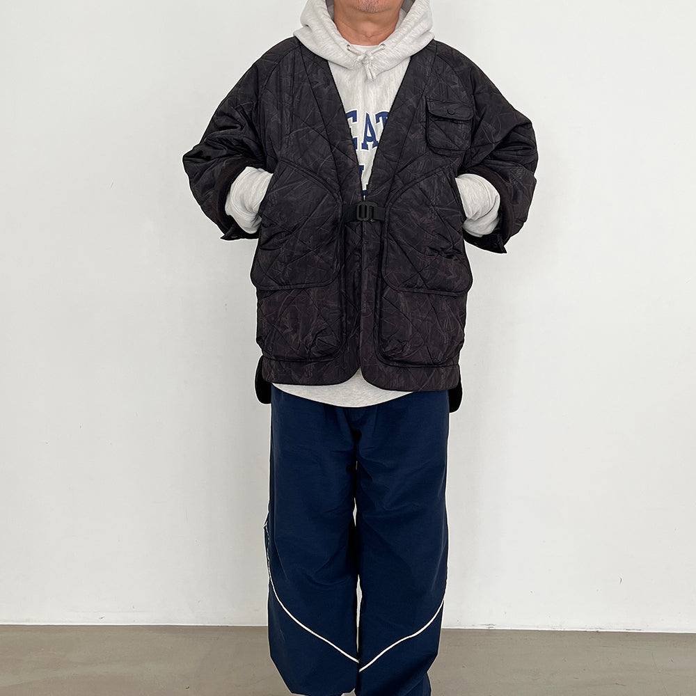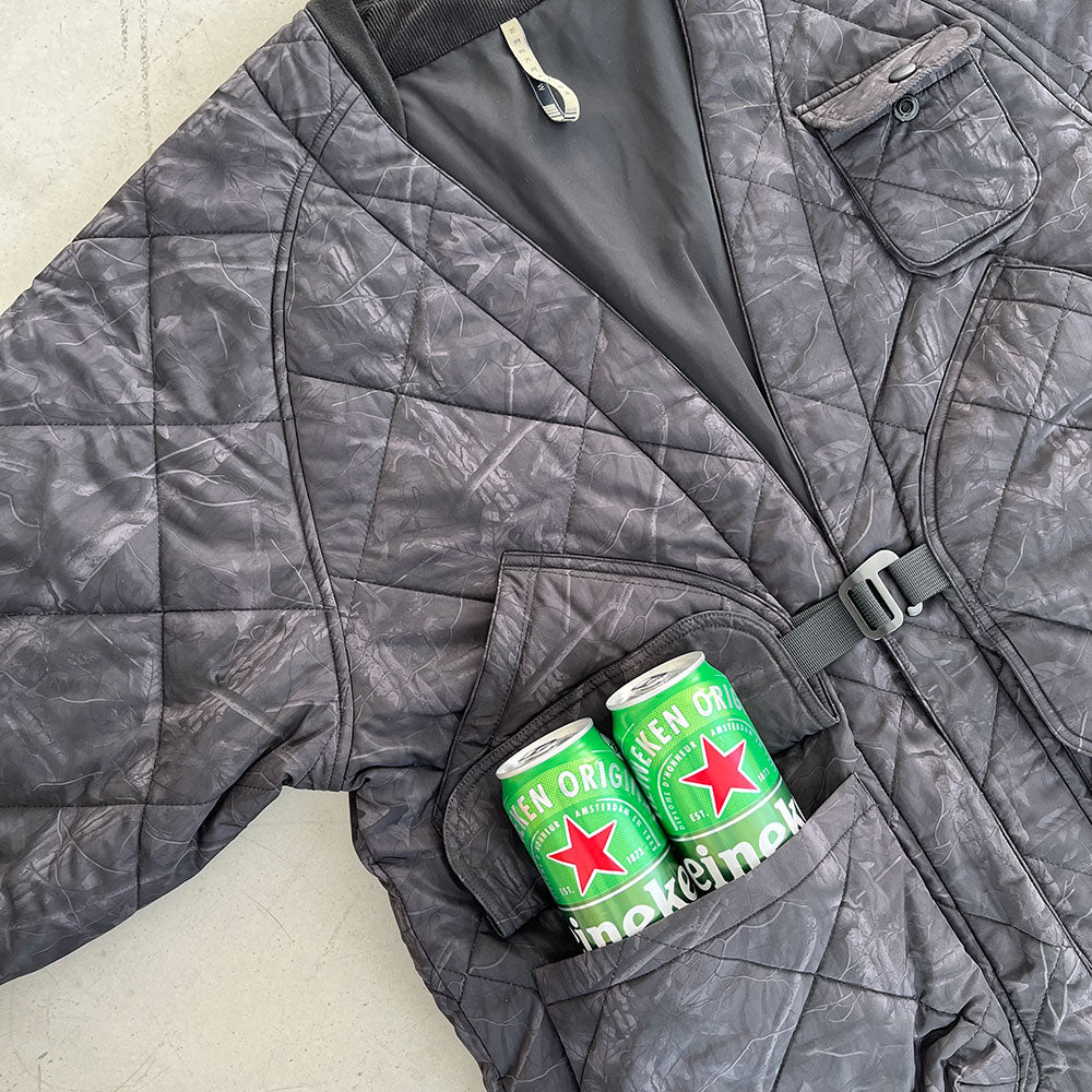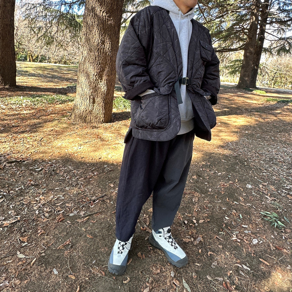 「コンビニまで晩酌用のビールとつまみを手ぶらで買いに行く」をコンセプトに、買ったモノを入れるポケットのベストなサイズ感と寒い時に手を突っ込めるハンドウォーマーポケットなどハンティングジャケットの仕様をオマージュすることで、機能的にも理想的な家呑み愛好家用DAN-TENがデザインされました。