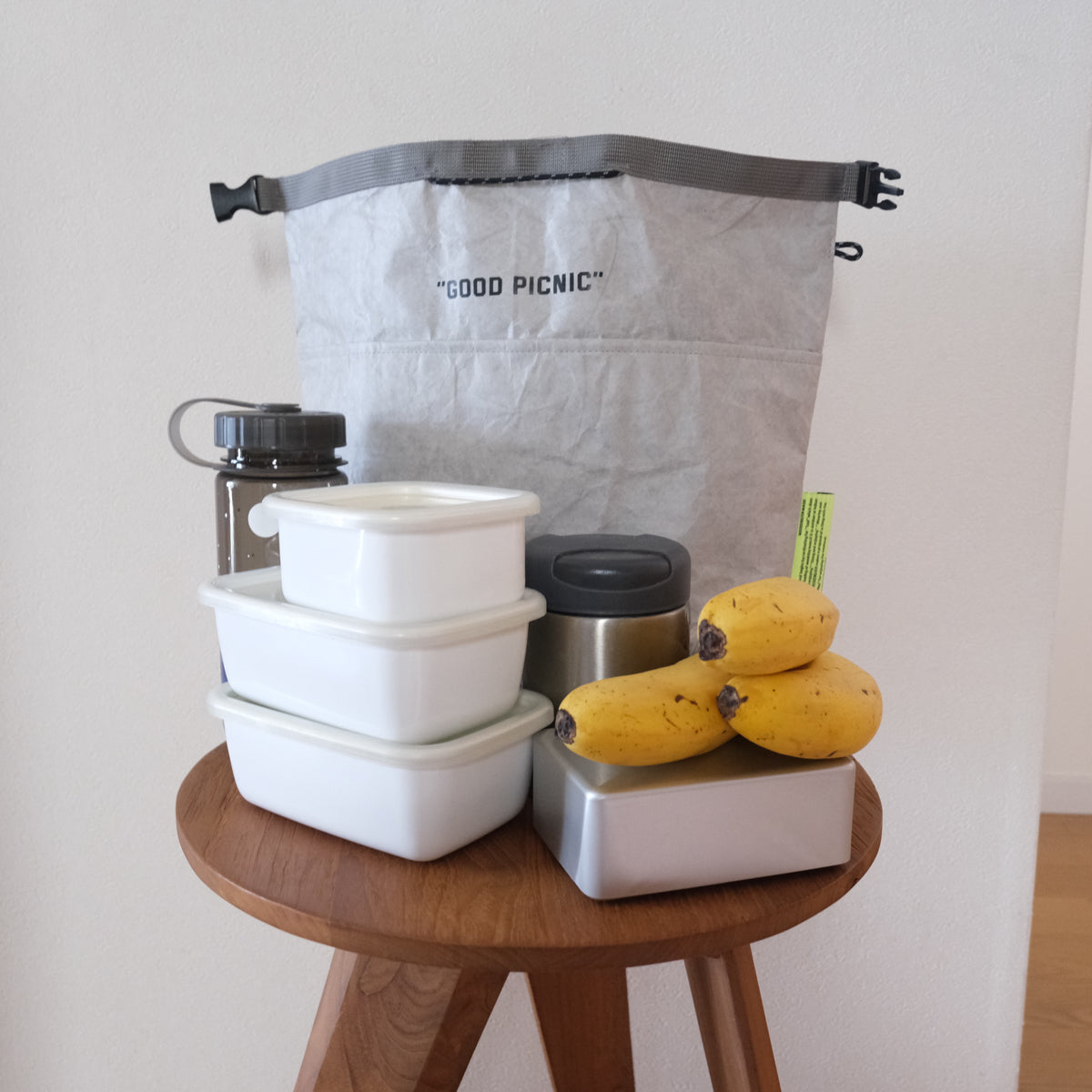 画像のようにお弁当箱とスープボトル、缶ジュースやフルーツなどが入るサイズ。