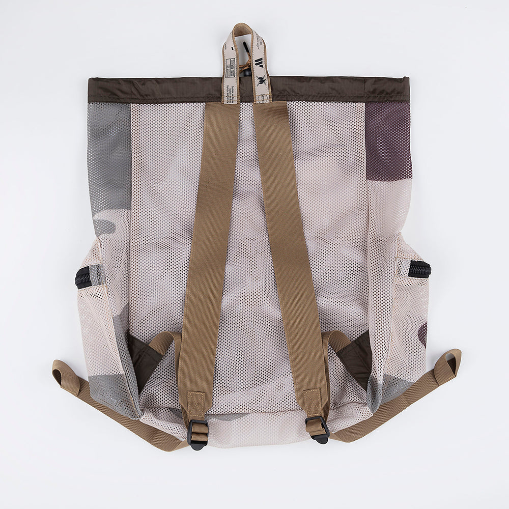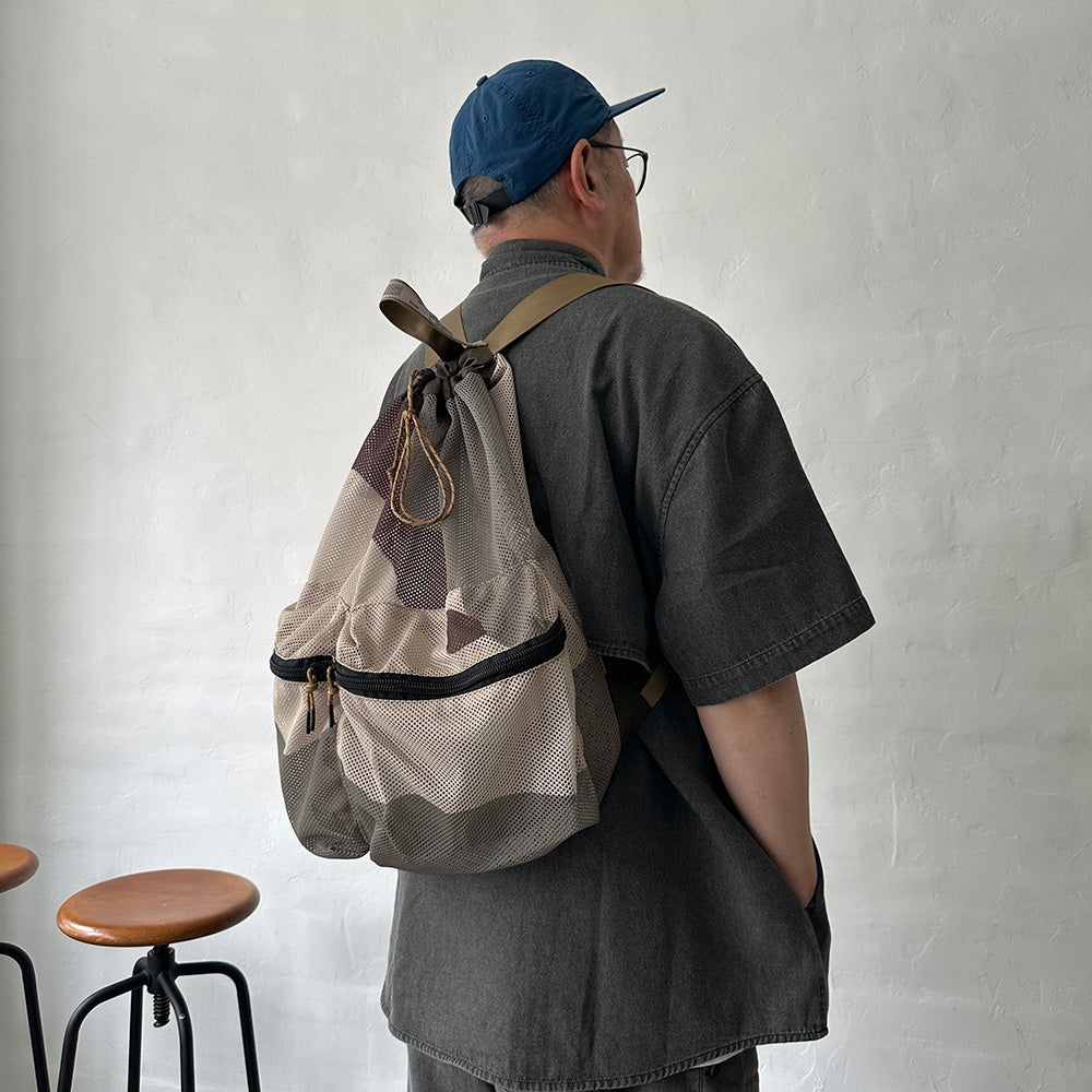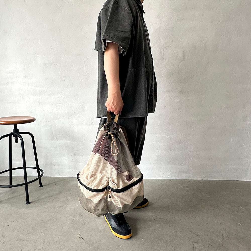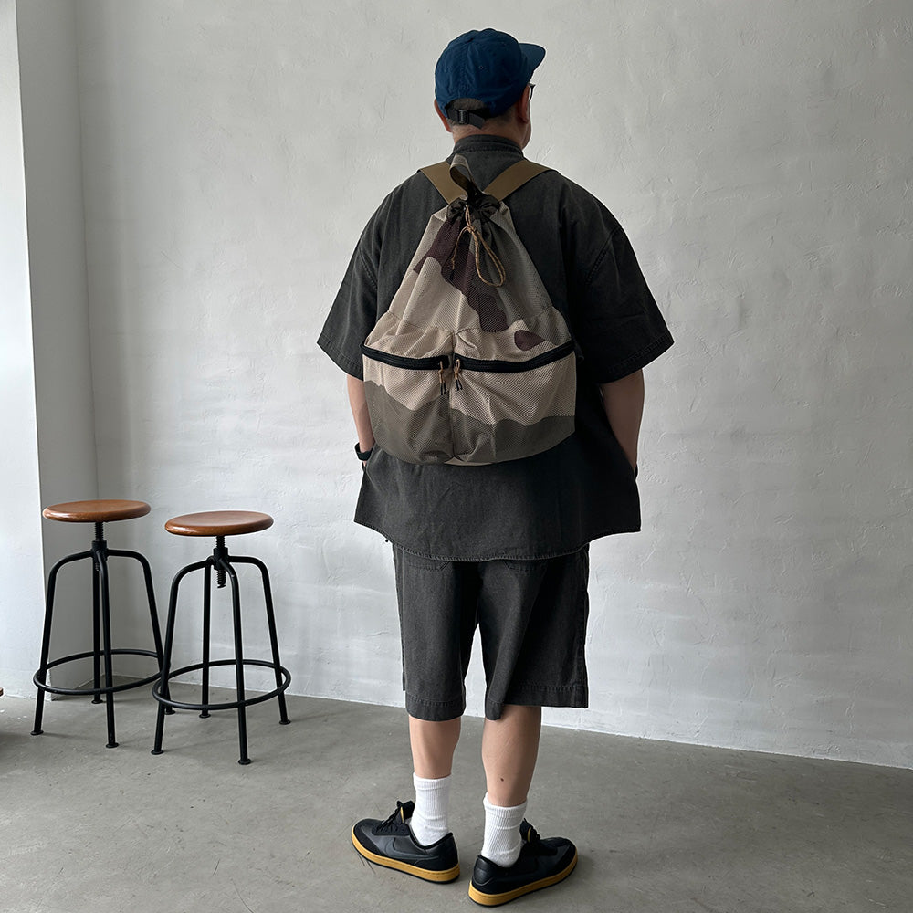 厚手でしなやかな素材感のメッシュ生地を使用したバックパック。3COL/サンド、オリーブ、ブラウンカラーを大胆に配色したデザート系カモのプリントを施した2026の新柄。巾着式の開閉や前面の大きなポケットが便利なデザインです。キャンプなど外遊びに活躍する大きめのサイズ感です。