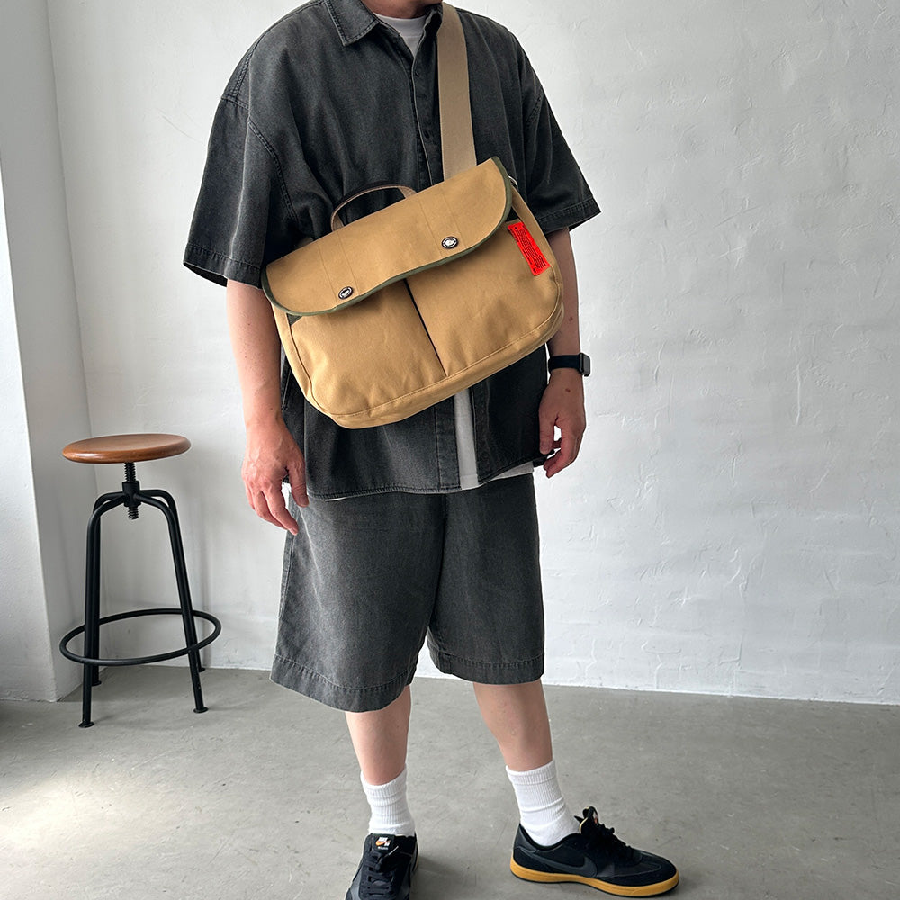 コットンキャンバスを使用したゲームバッグ。クラシカルなデザインに、荷物の出し入れがし易い面ファスナー開閉など使いやすさをプラス。生地は12ozのコットンキャンバスの裏面にラミネートコーティングを施しコシを持たせています。天然素材x金属パーツのクラシカルなデザインに反射生地のラベル使いなどWEEKEND(ER)らしいデザインです。ハンドルやカシメのワッシャーに本革を使用するなど一見するとヘビーな印象ですが見た目よりも軽く軽快な仕上がりです。