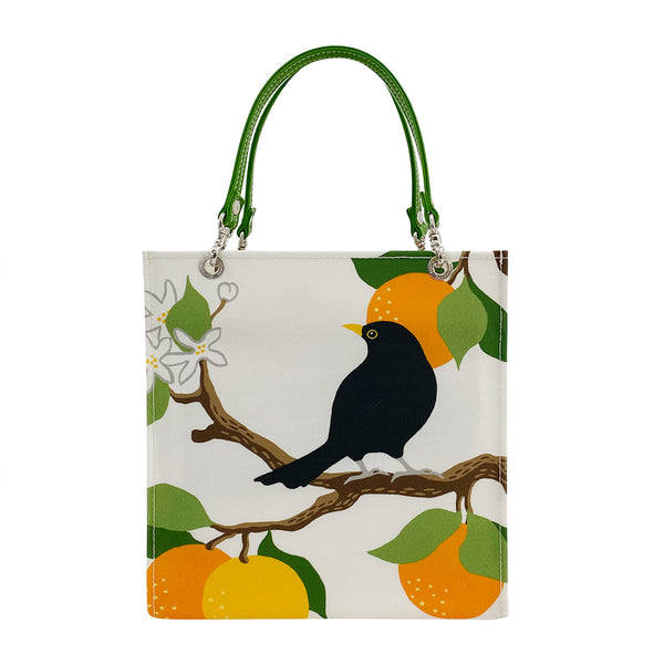 グリーンの持ち手がポイントの鳥柄エトフです。