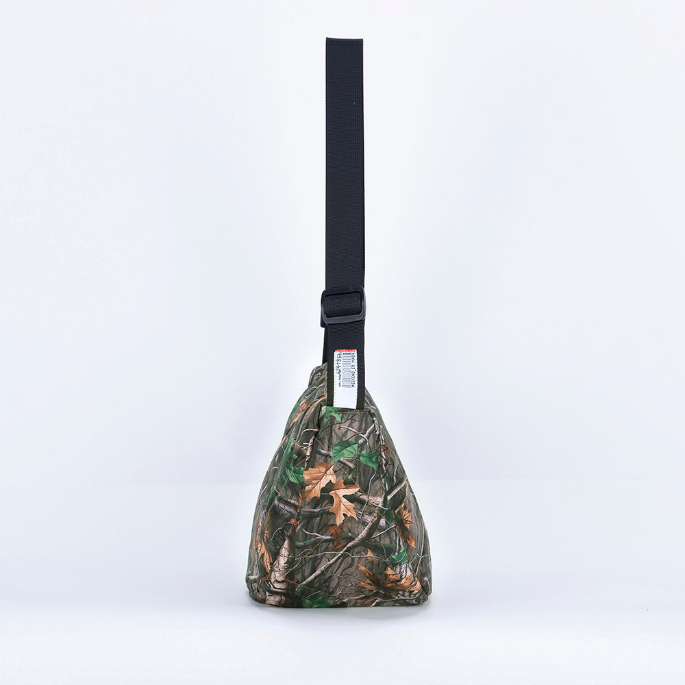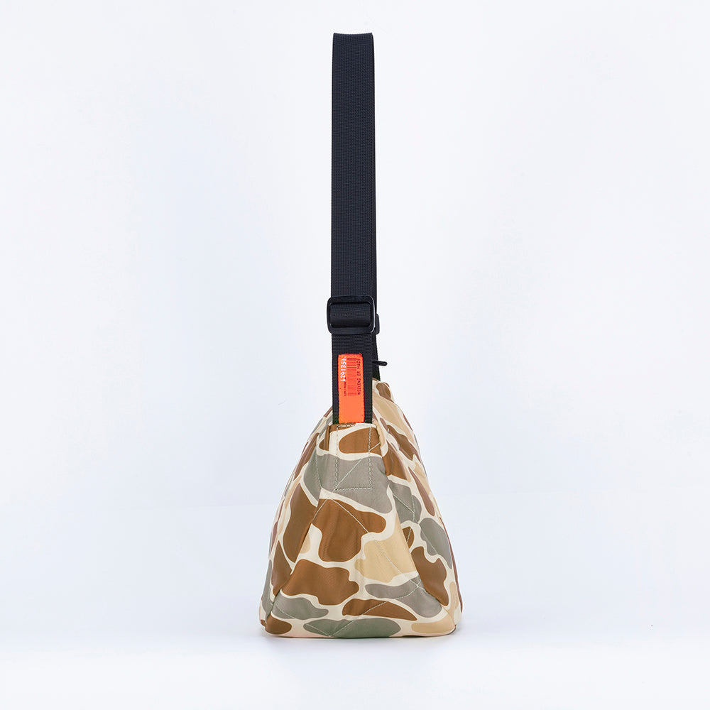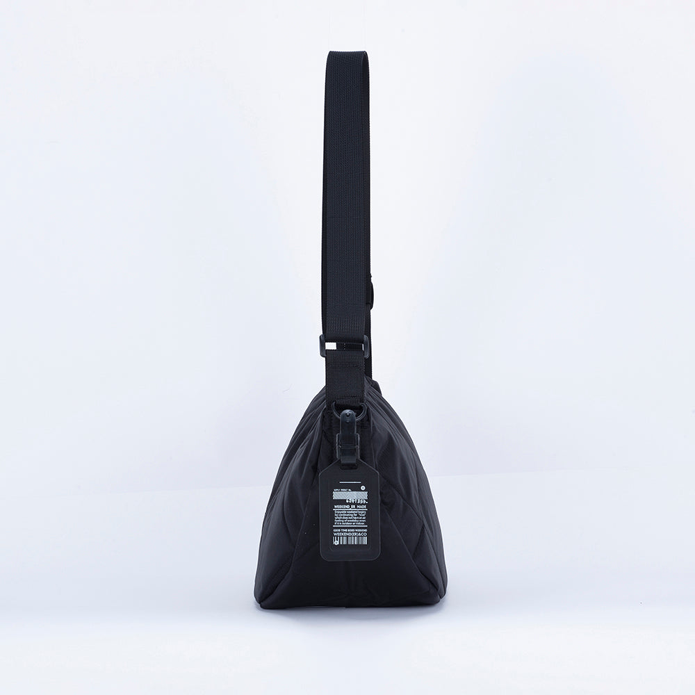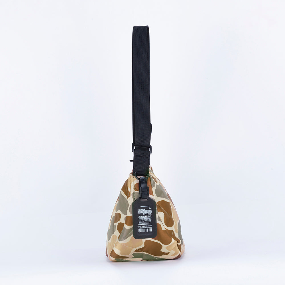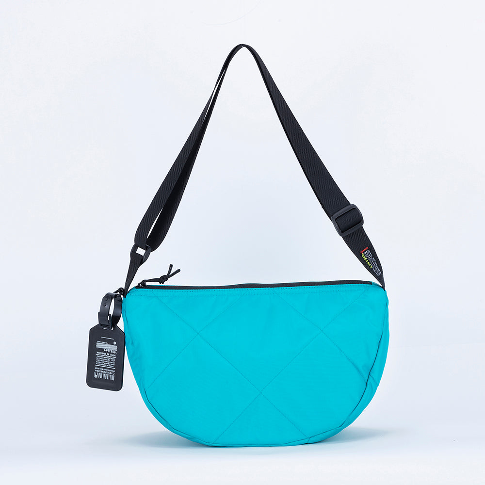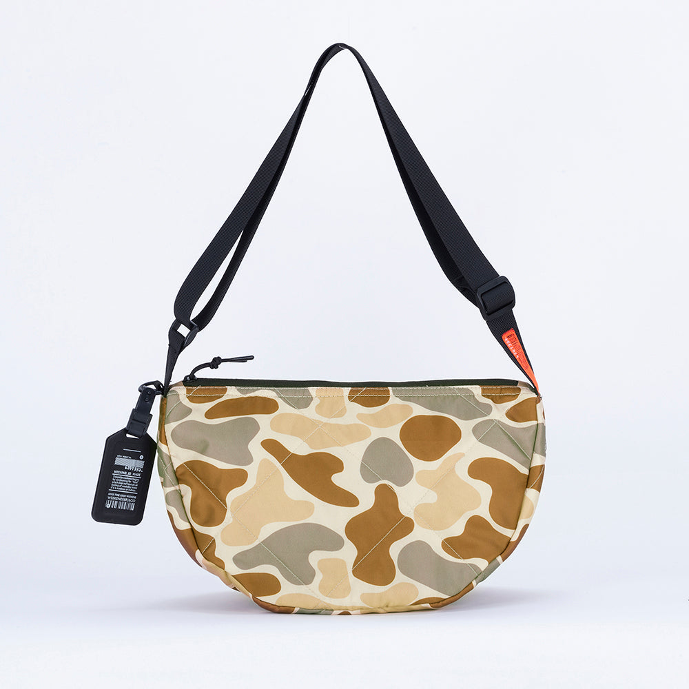 人気の半円型ショルダーバッグ。マチ幅を大きく取り収納量を増やしました。ナイロン(無地)とポリエステル(柄)素材に120gの樹脂綿をダイヤ型にキルティング。山中をイメージしたカモフラージュ柄や90sのアウトドアシーンをイメージしたティールグリーンと定番のブラックの4色展開。WEEKEND(ER)らしい樹脂製のチープな反射タグが付いています。