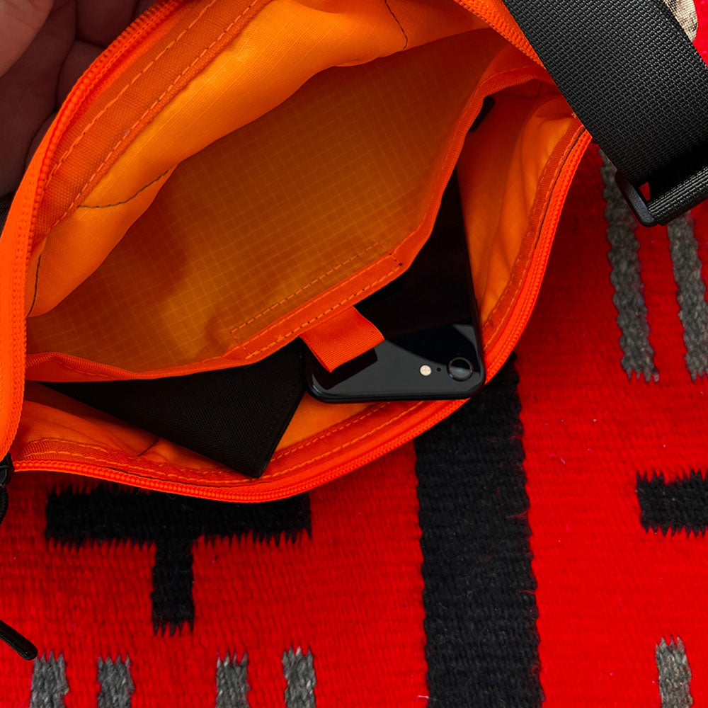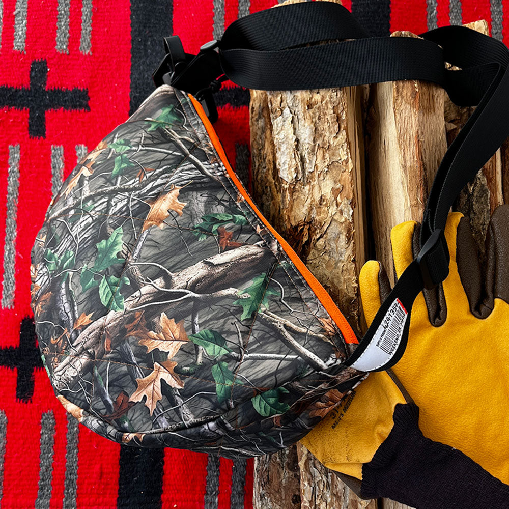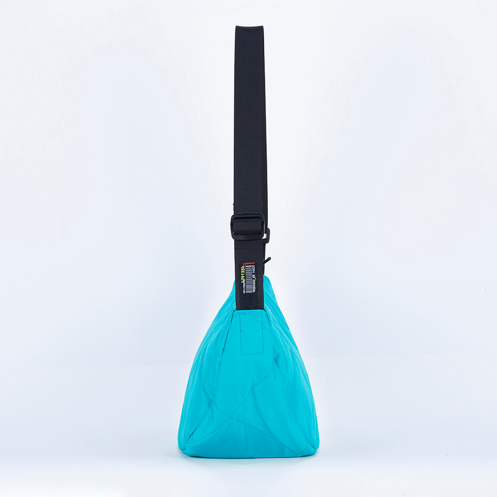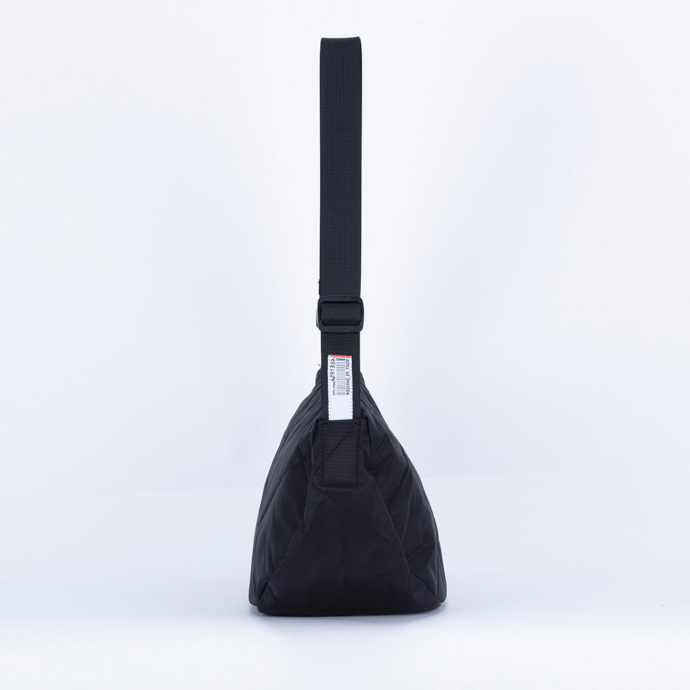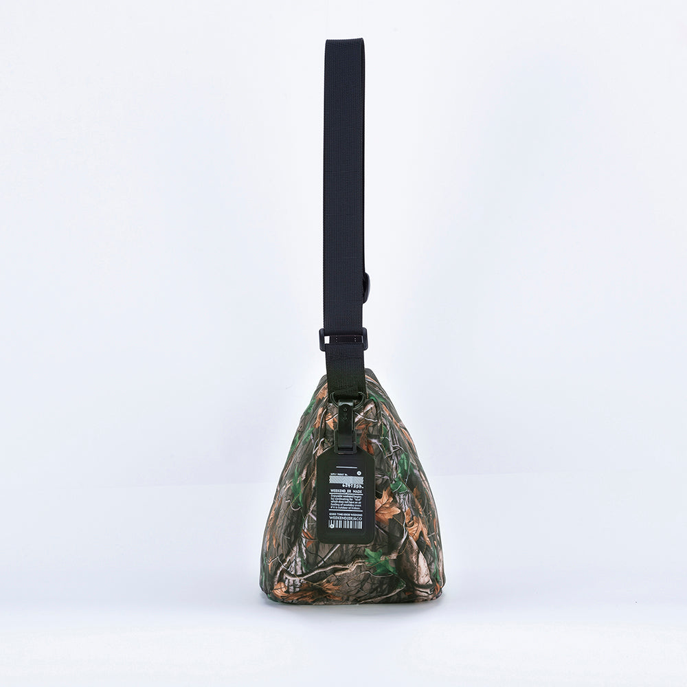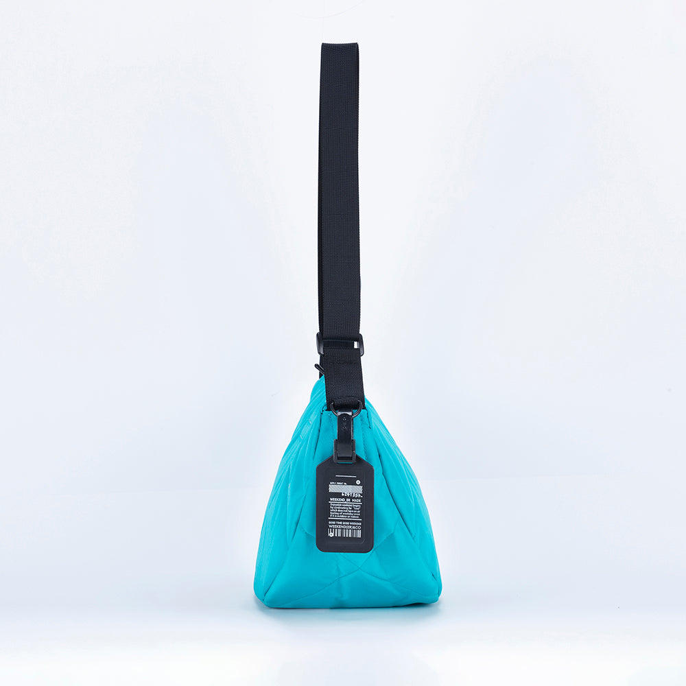 人気の半円型ショルダーバッグ。マチ幅を大きく取り収納量を増やしました。ナイロン(無地)とポリエステル(柄)素材に120gの樹脂綿をダイヤ型にキルティング。山中をイメージしたカモフラージュ柄や90sのアウトドアシーンをイメージしたティールグリーンと定番のブラックの4色展開。WEEKEND(ER)らしい樹脂製のチープな反射タグが付いています。